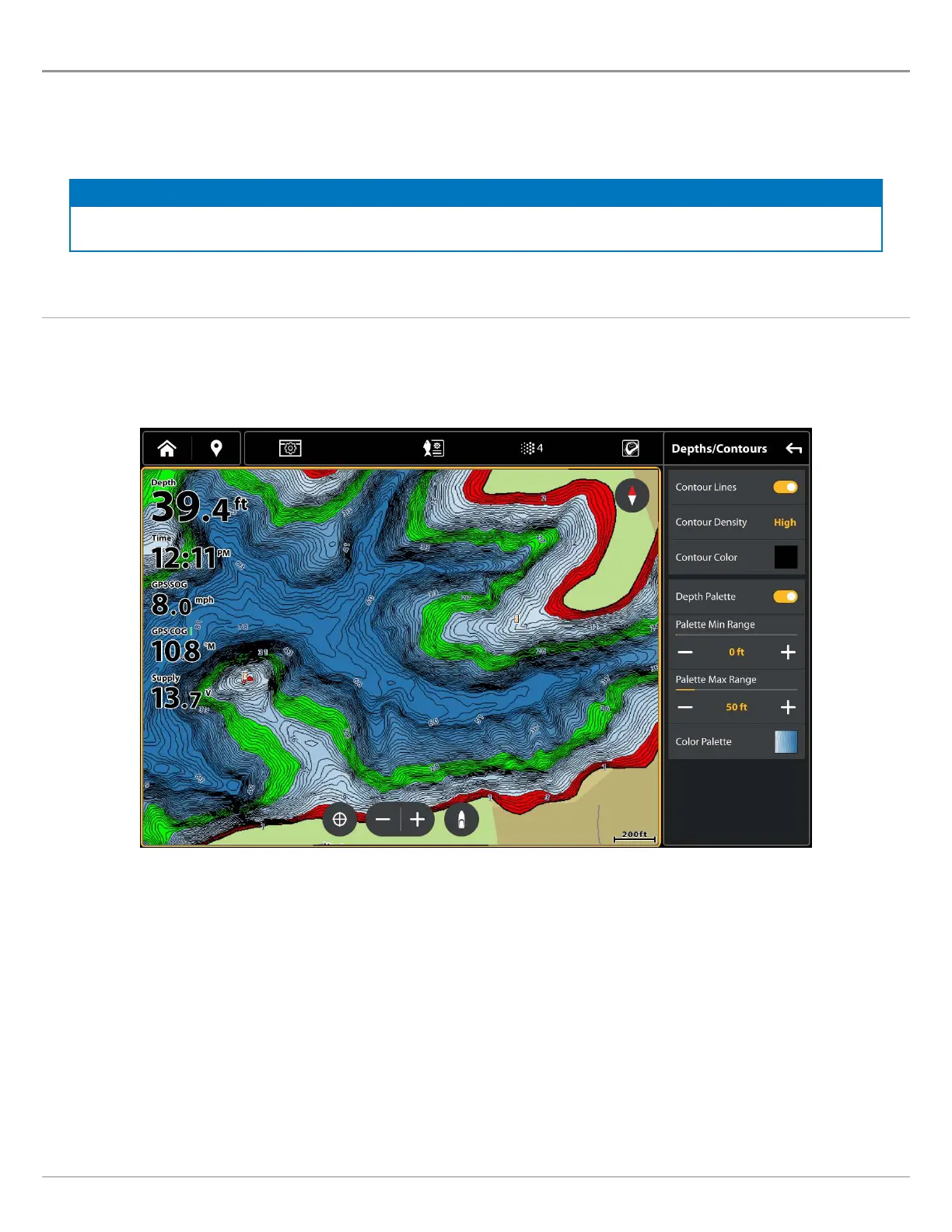 show or hide contour lines, highlight a depth range on the map, highlight shallow water, set safe depth levels and more.