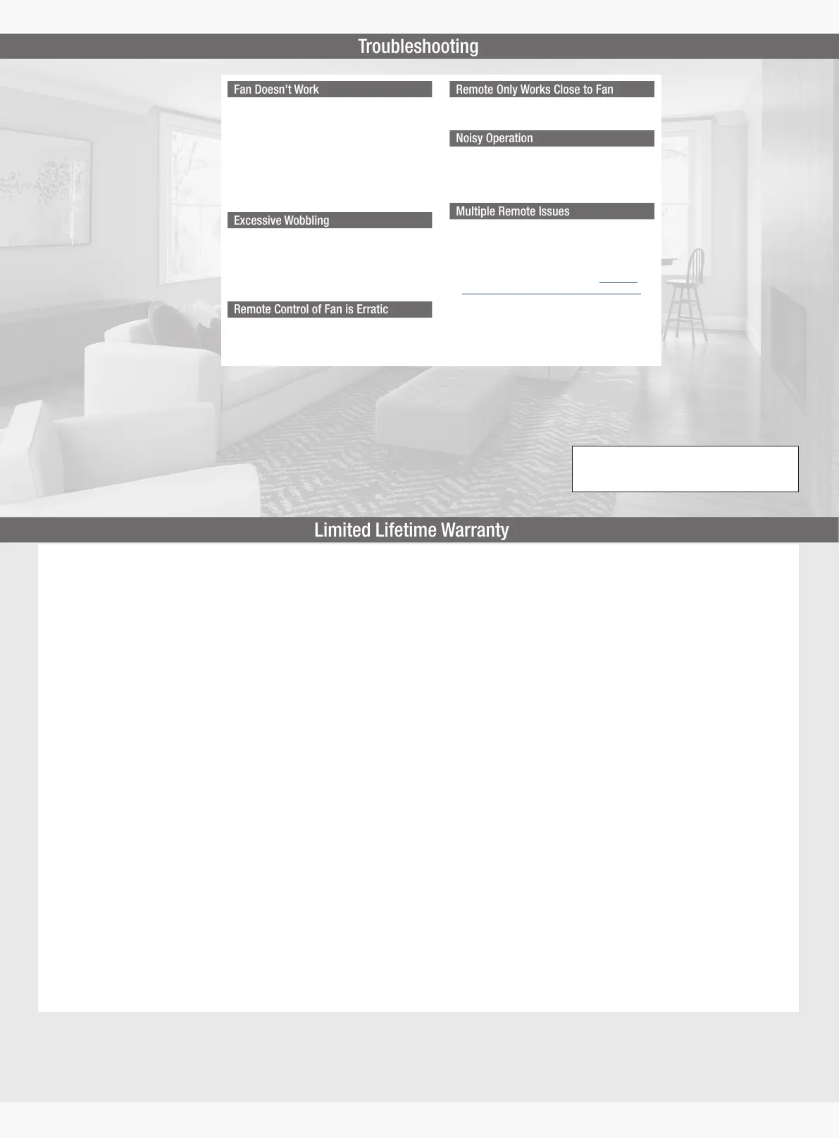 There is no warranty for light bulbs; remote control batteries; fans purchased or installed