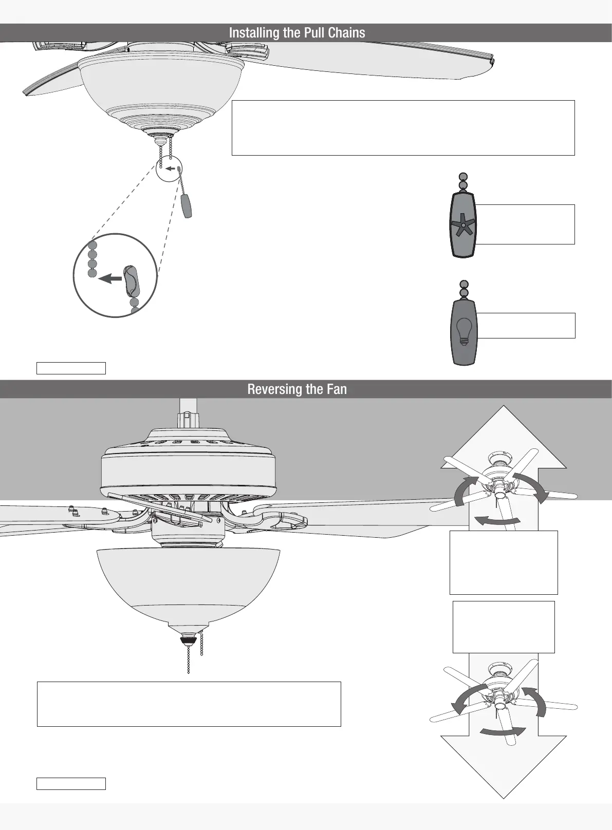 Attach the pull chain pendants to the light and fan pull chains. To adjust the fan speed, pull the chain with
