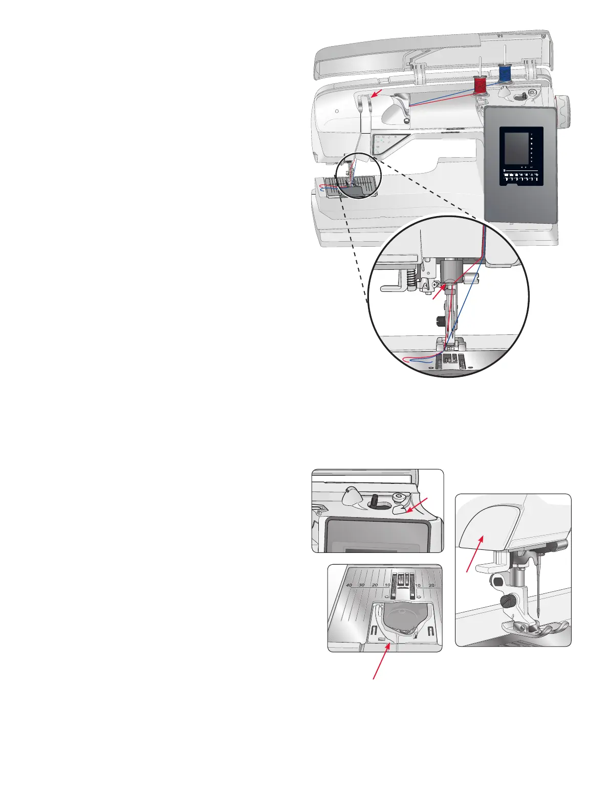 1. Breng de garenpen omhoog en helemaal naar rechts.