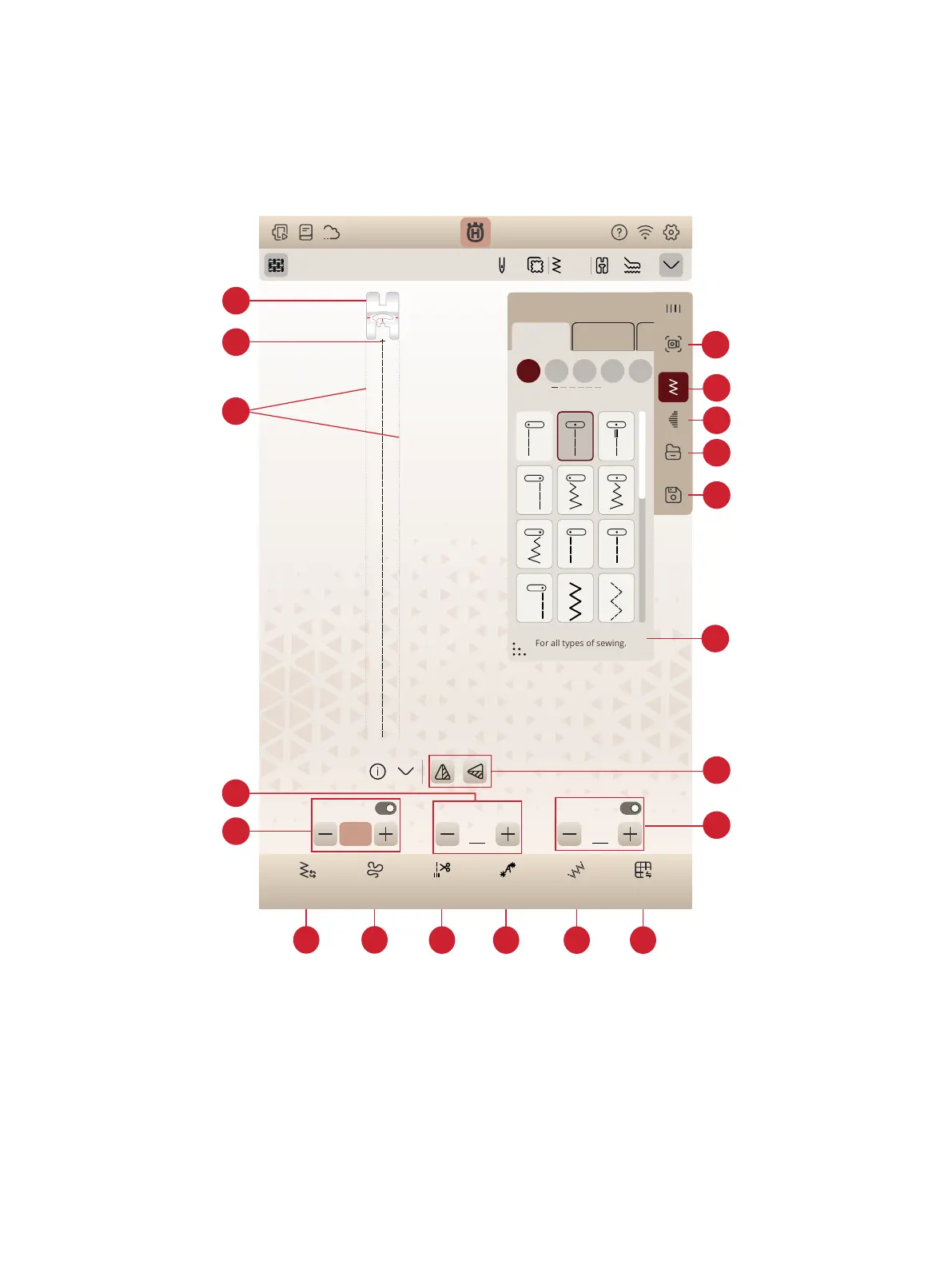 In de naaimodus kunt u steken selecteren, aanpassen en naaien. De geselecteerde steek wordt op ware grootte weergegeven in