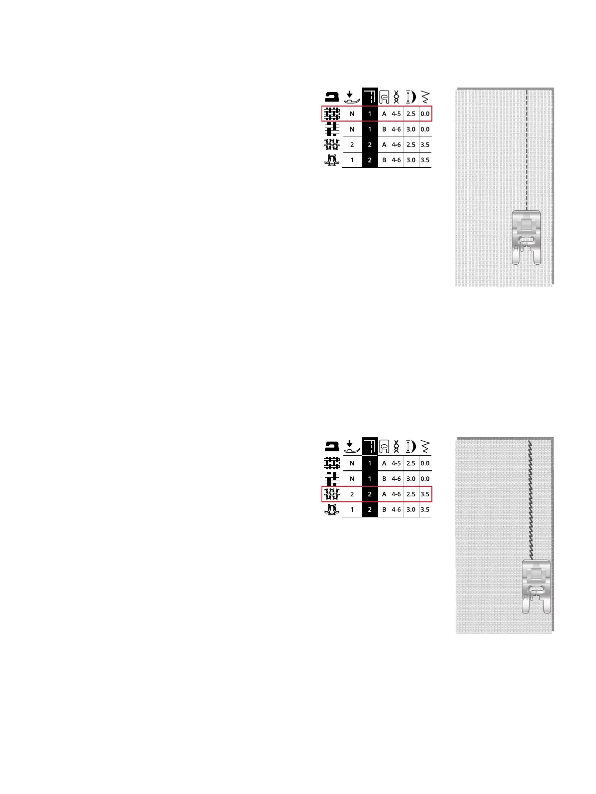 Stel in: Draadspanning 4–6, steeklengte 2.5, naaldpositie 0.0