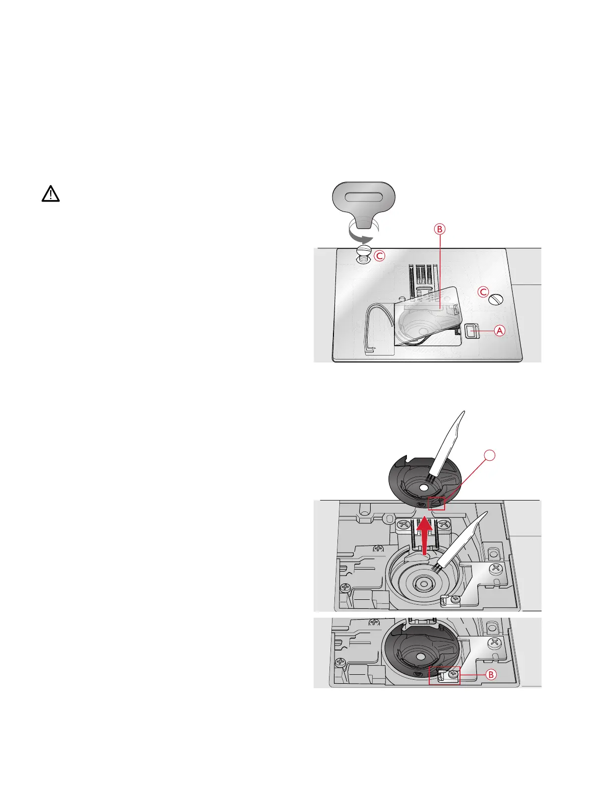 Verwijder de naaivoet. Duw het ontgrendelknopje van het