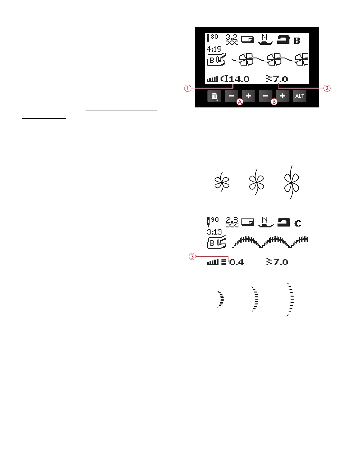 Vergroot of verklein de steekbreedte met de toets + of - (B).