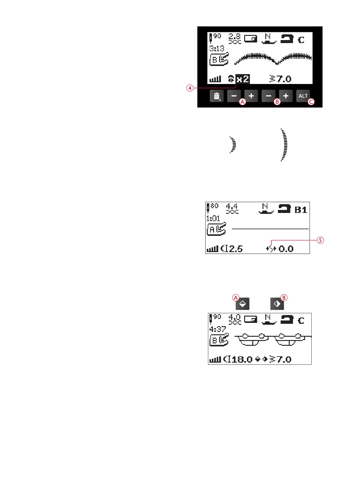 op het grafische display in plaats van de steekbreedte. De
