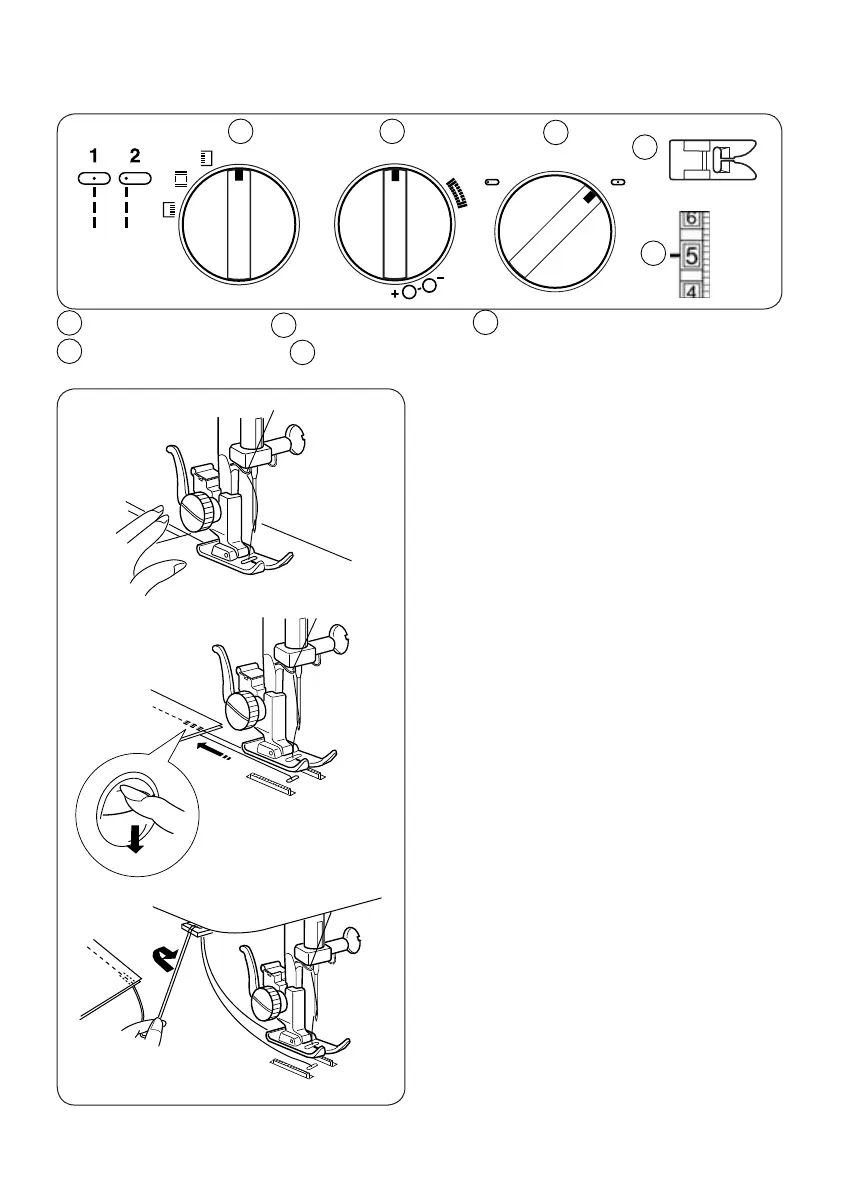Stitch selector: 1 or 2 Stitch length: 1.5 - 4 Stitch width: 5 or 0 (for Model 215)