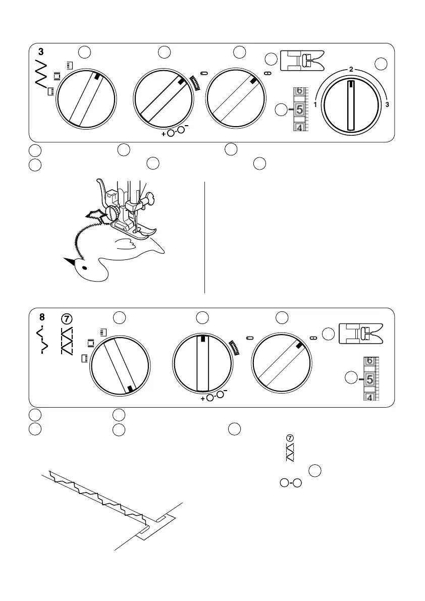 Stitch width: 5 Presser foot: Zigzag foot Thread tension: 4 - 6