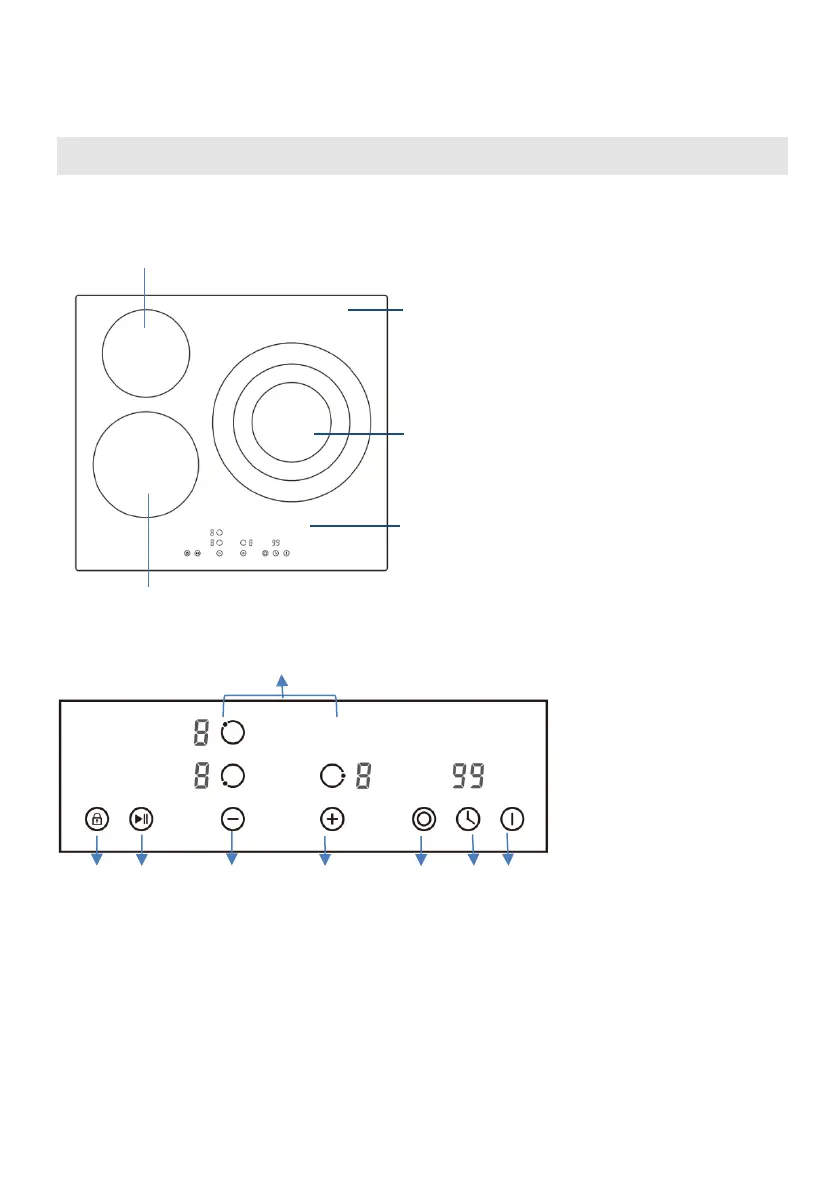 1. Cooking zone selection button 2. Child Lock control button