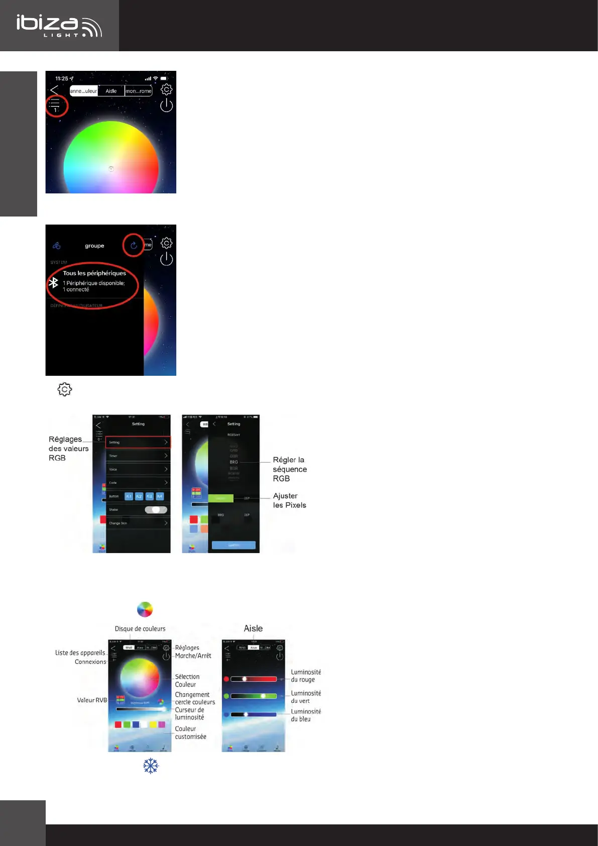 1. Dans le menu Paramètres: vous pouvez dénir le rythme, la séquence RVB, ajuster les pixels, régler la