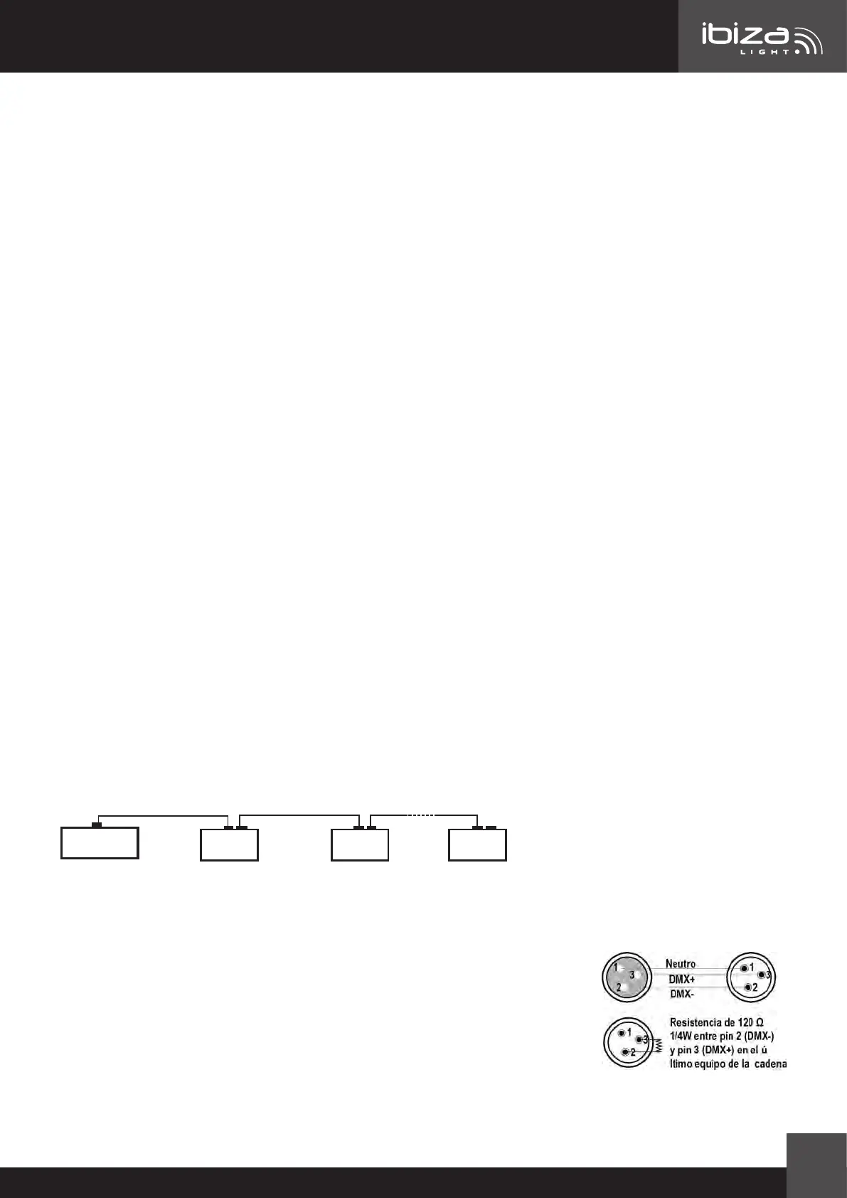 3. Y siga conectando cada salida del equipo a cada entrada del siguiente equipo de la cadena DMX y así sucesi-