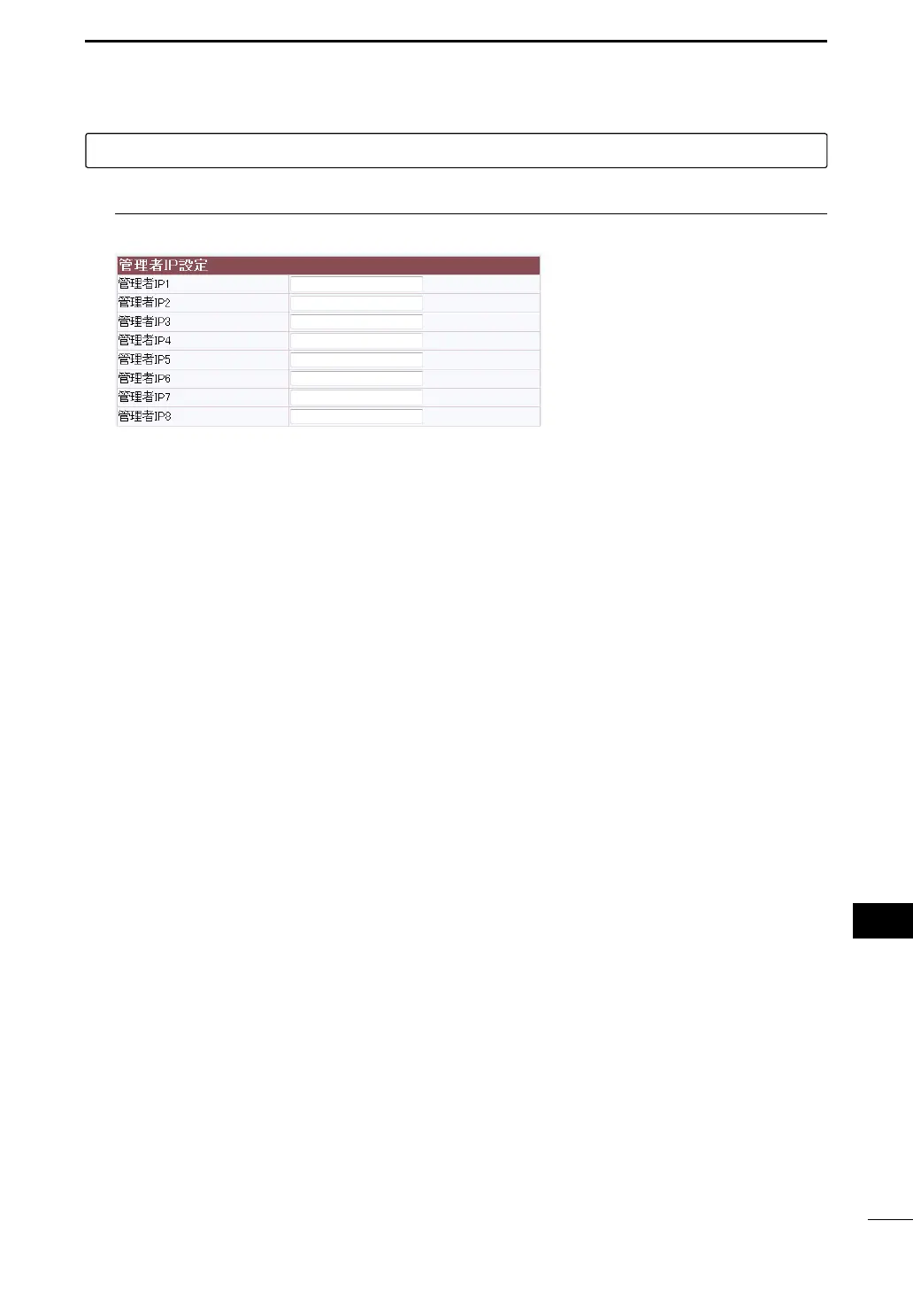 管理者IP1~8 …………… 本製品の設定画面へのアクセスを制限するために、本製品にアク