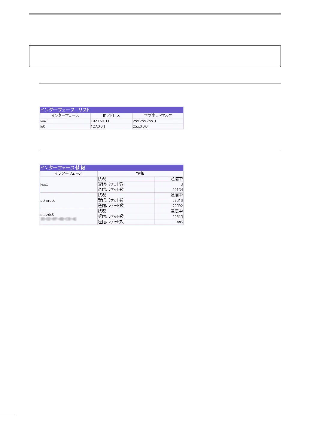 各インターフェースの経路と情報、および本体MACアドレスを表示する画面です。