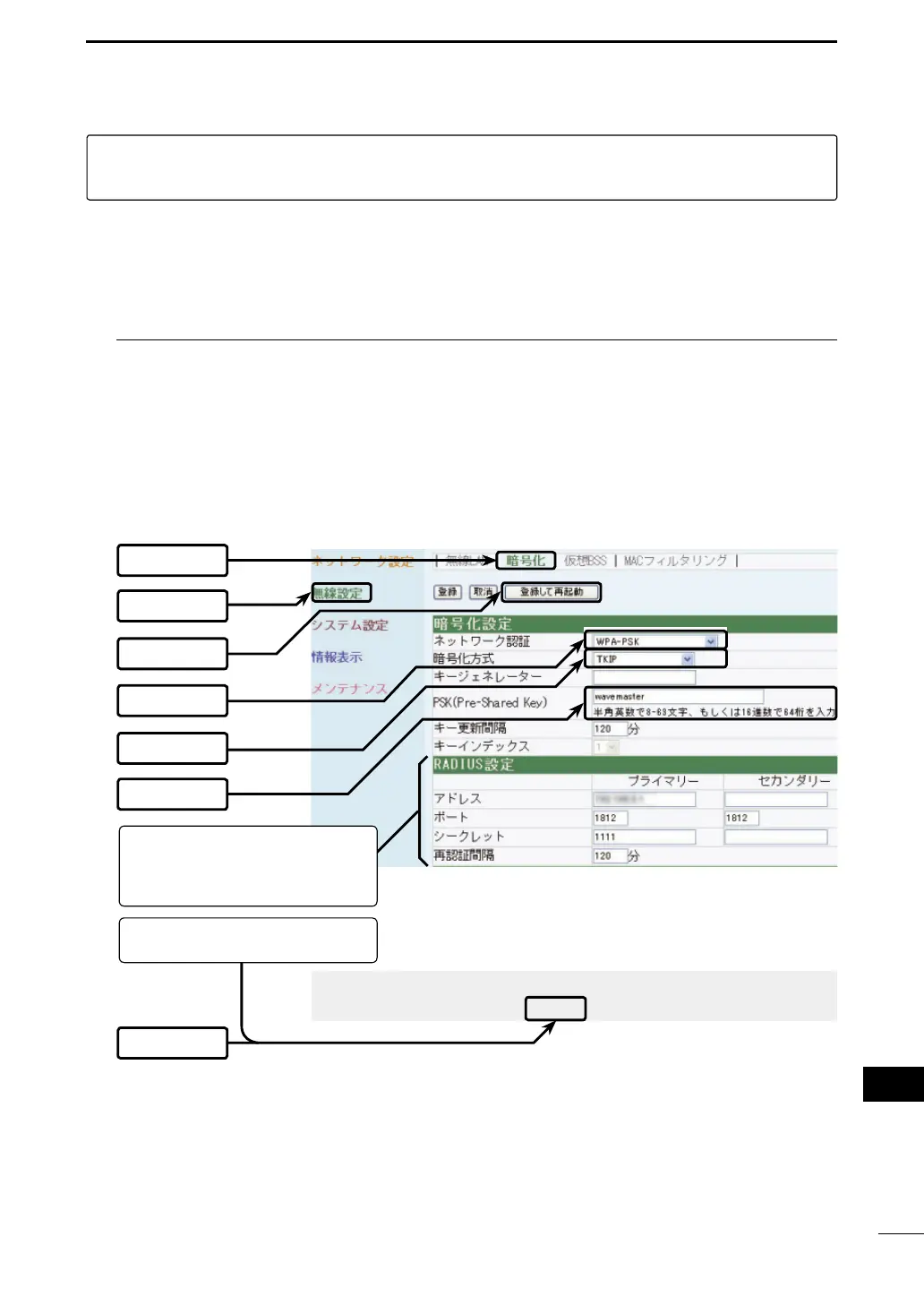 [PSK(Pre-SharedKey)]:「wavemaster」(ASCII文字の場合)
