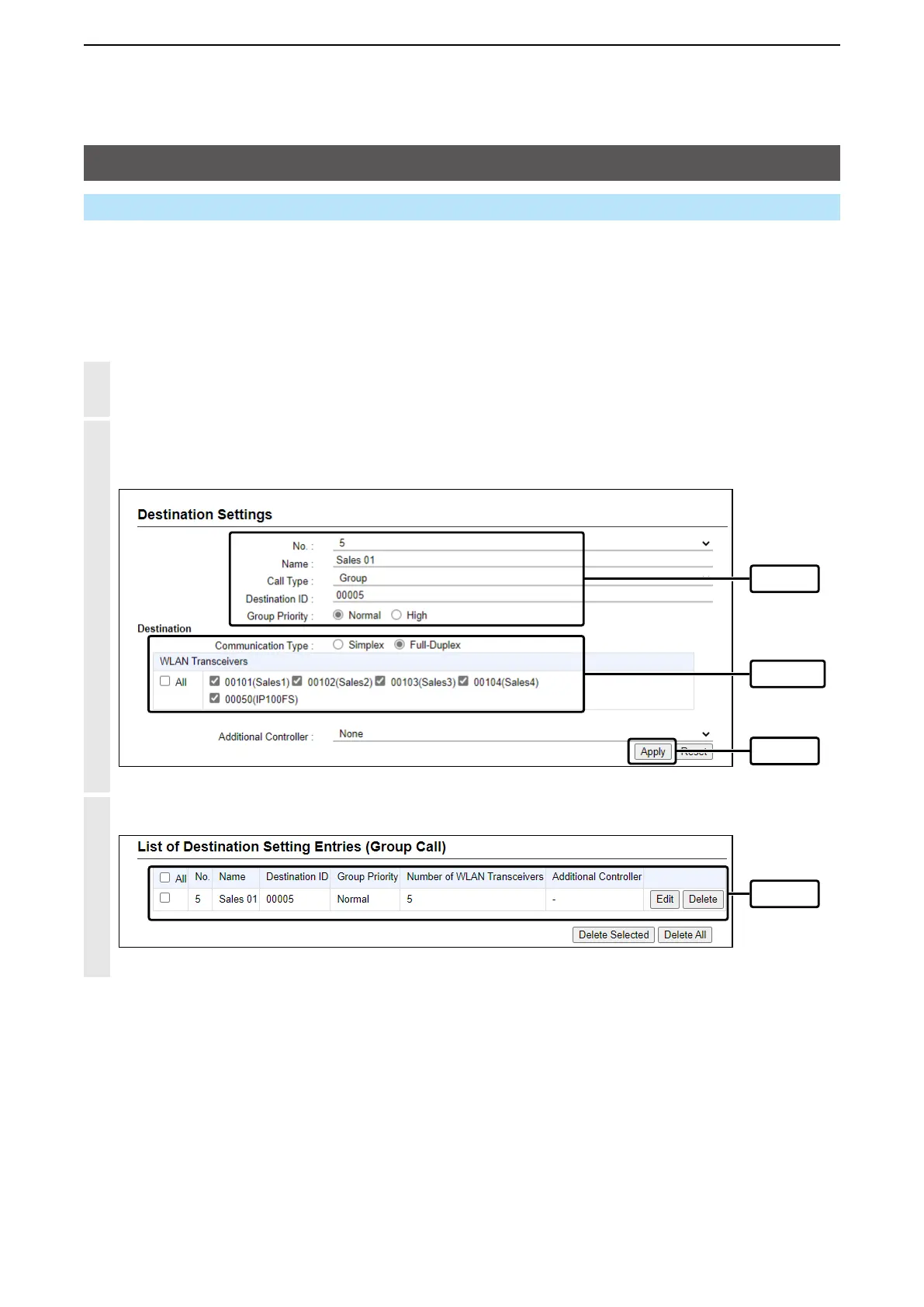 2 In [Destination Settings], enter Name, Call Type, and Group ID (00001 ~ 60000), select the target WLAN