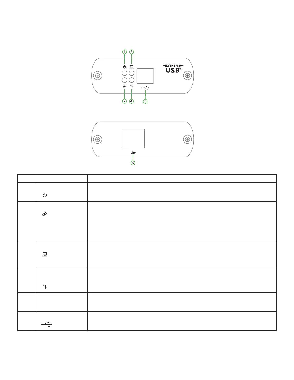 2 Link LED (Green) Indicates a valid ExtremeUSB link is established between the LEX and REX.