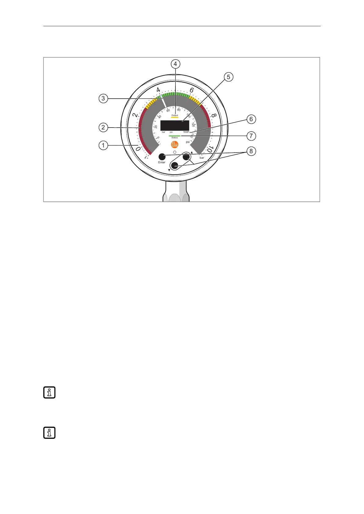 3: LED pointer: White LED, not visible when the unit is not powered. Indicates the current pressure value between 0 and the
