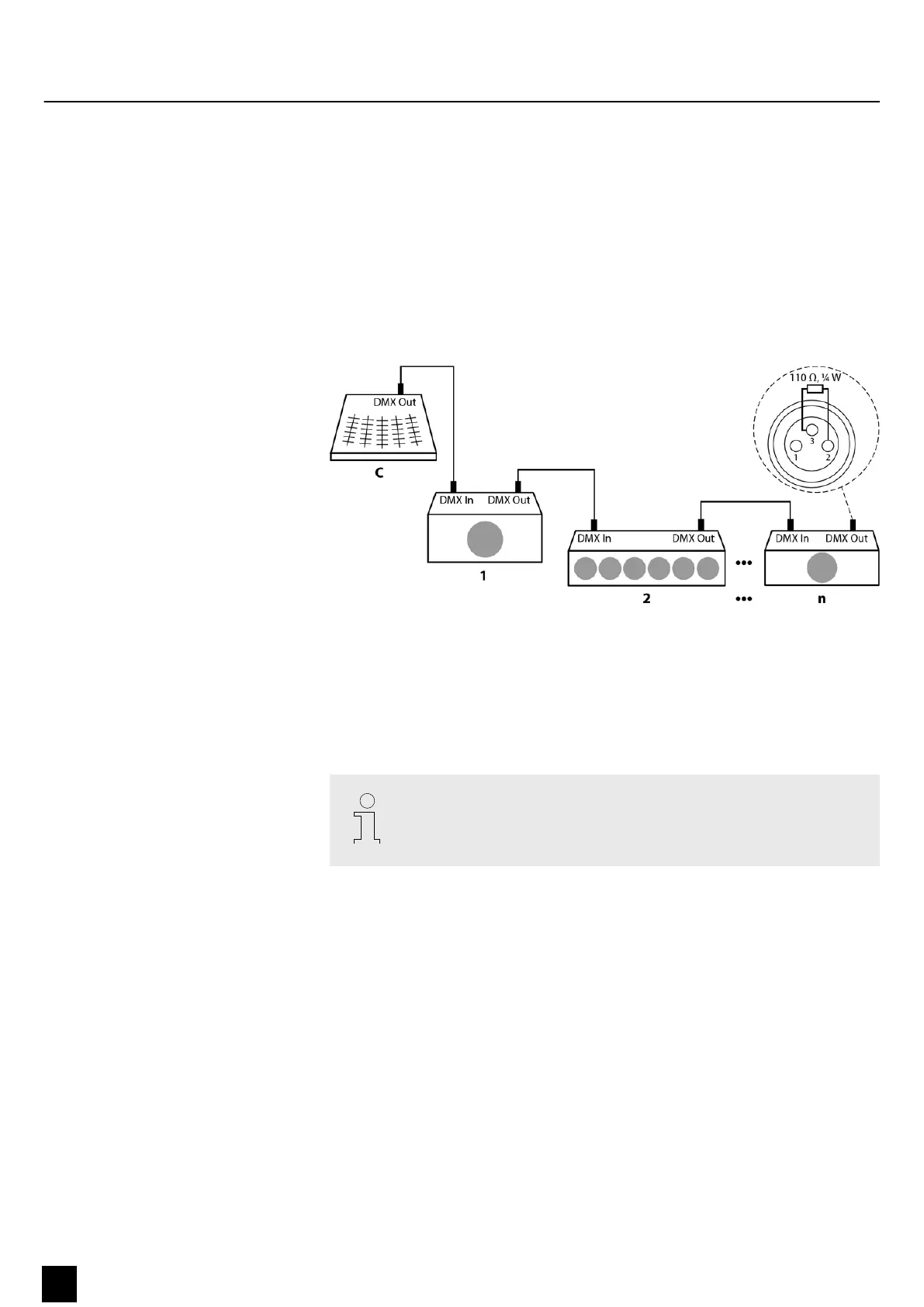last DMX device in the daisy chain is terminated with a resistor (110 Ω, ¼ W).