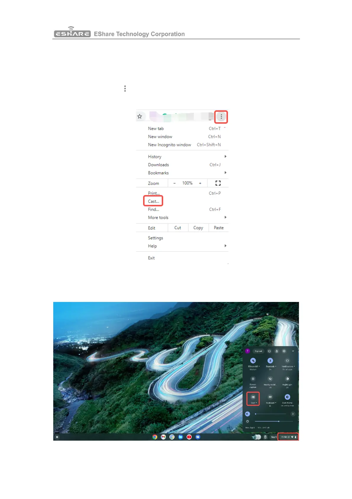 Click the "More" icon in the top right corner of the Chrome browser, find the “cast”