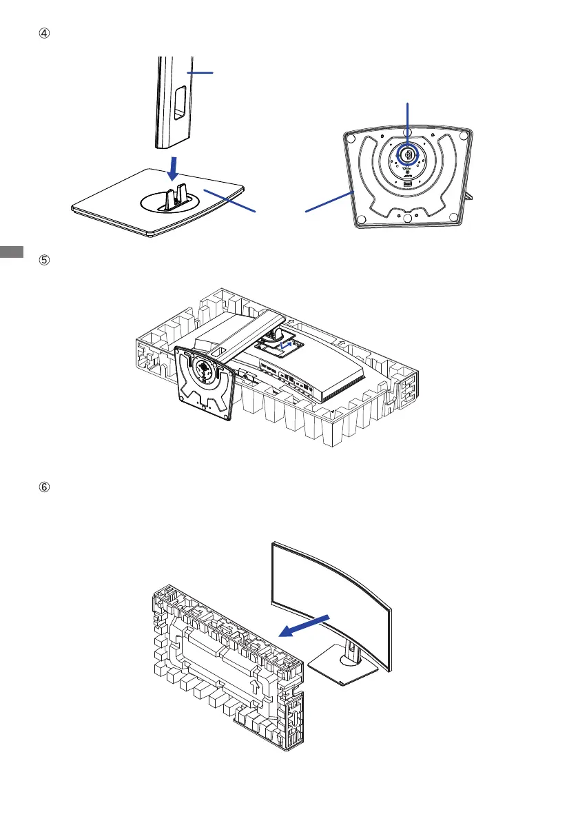 Hold the monitor and install the assembled stand to the monitor until it clicks to secure.