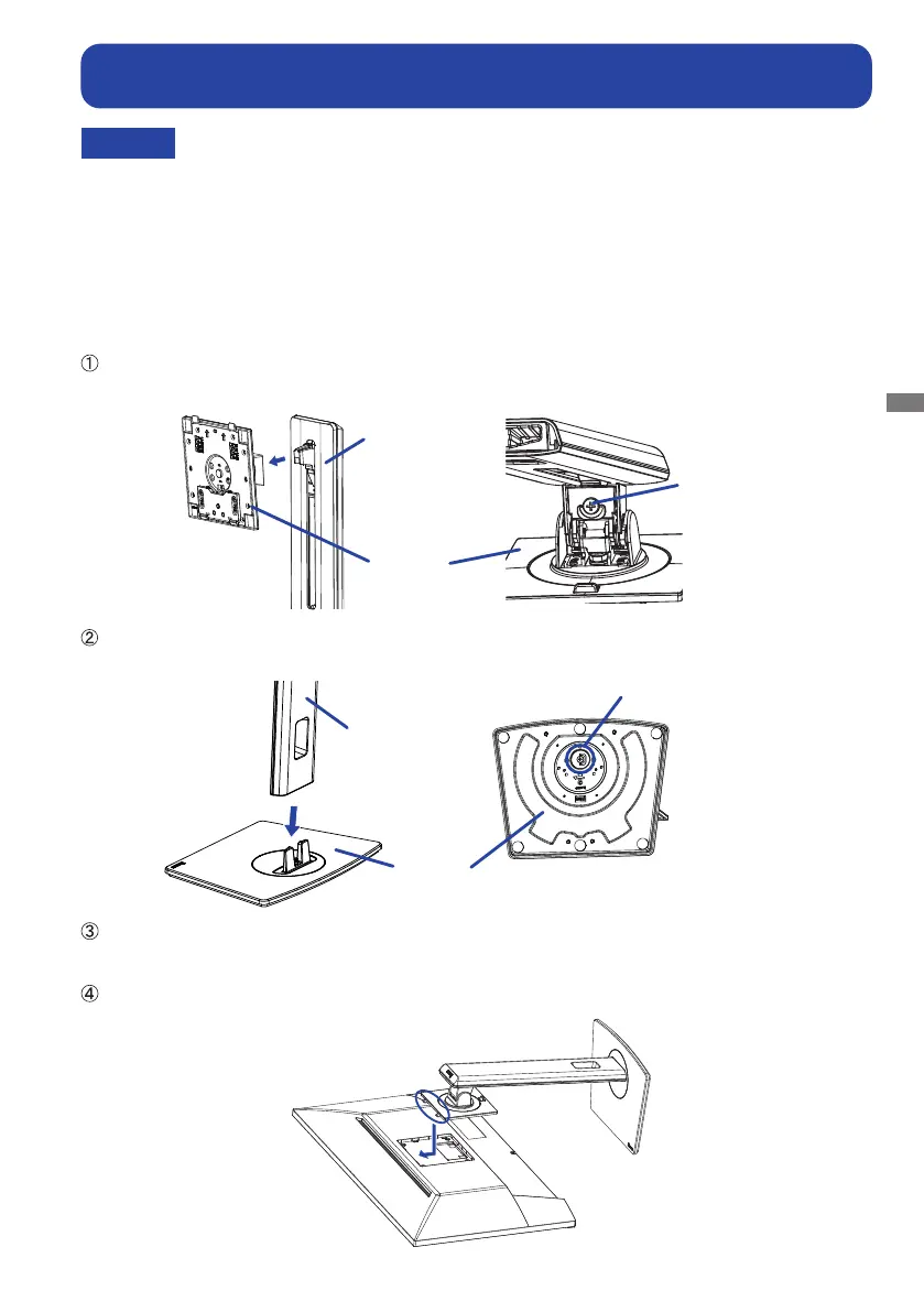 Hold the monitor and install the assembled stand to the monitor until it clicks to secure.