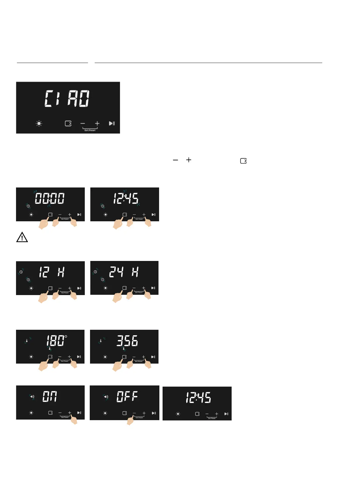 de klok, de weergave 12/24 uur, display ON (ON d) - OFF (NO d) de temperatuur in °C of °F en de Geluiden On/Off.
