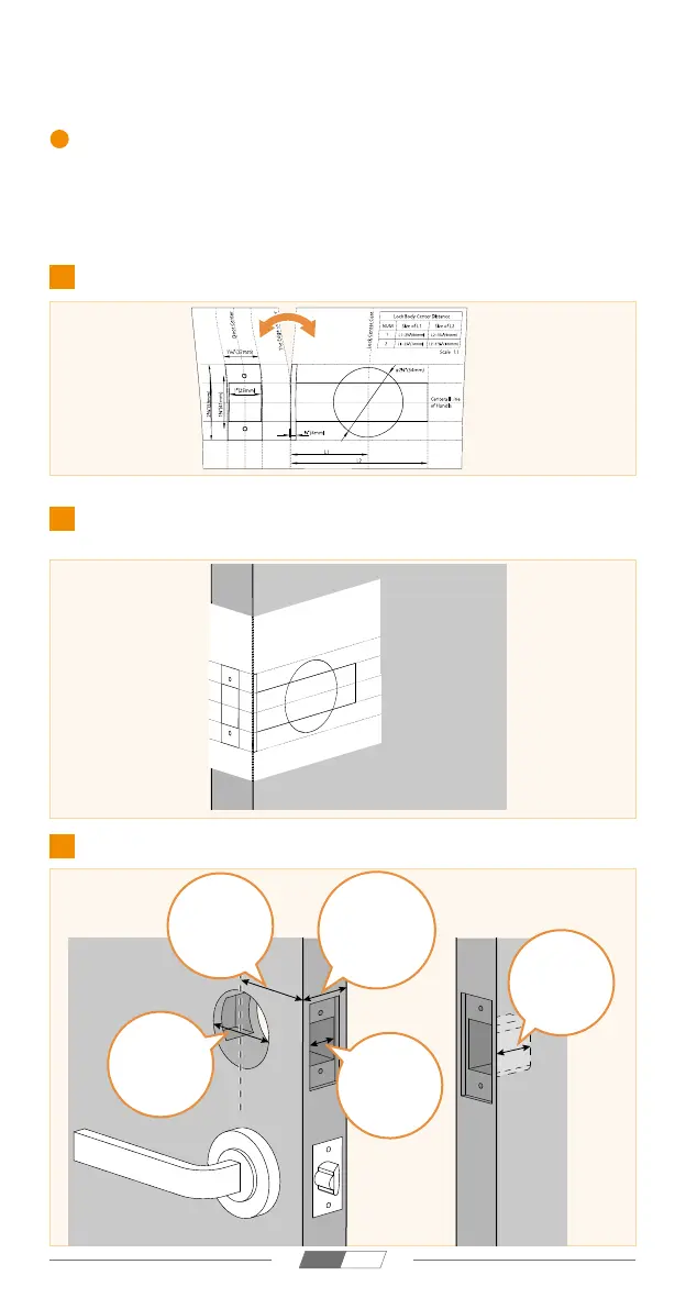 Fixe o modelo de perfuração à porta. Certifique-se de que as linhas centrais estão