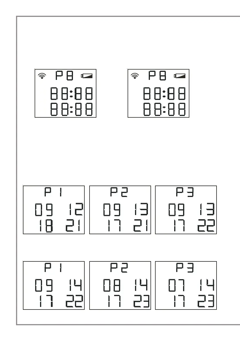 Bei Drücken der Tasten P1, P2 oder P3 erscheinen am Display die voreingestellten Programme wie in