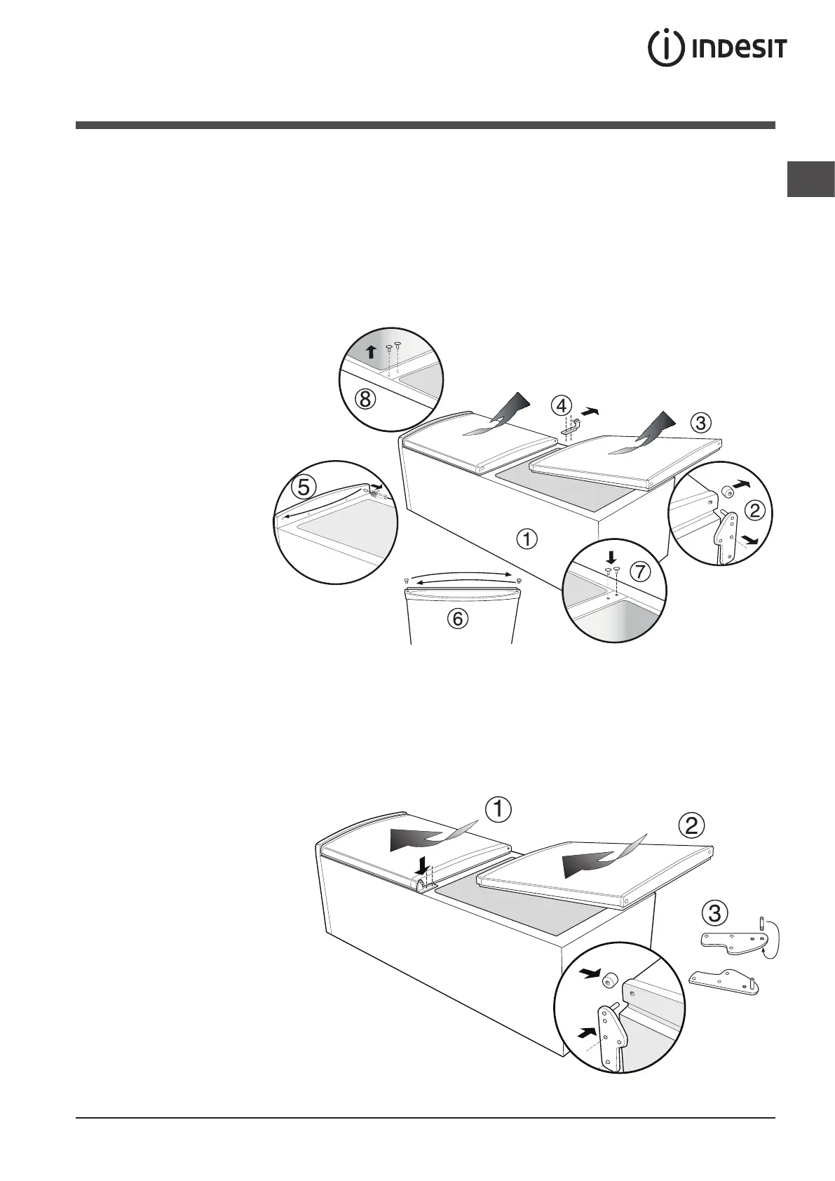 1. Far scivolare la porta superiore verso l’alto e inserire il perno d’incernieramento superiore all’interno della boccola della