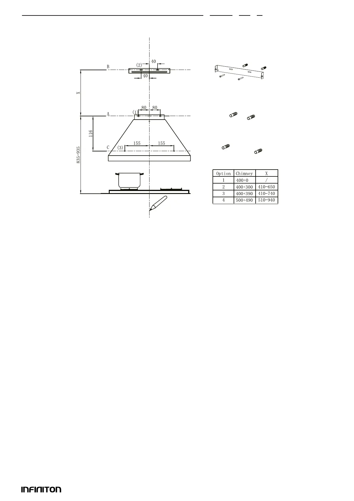 A vertical line up to the ceiling or to the upper limit, in the center of the area where the hood is to be ins-