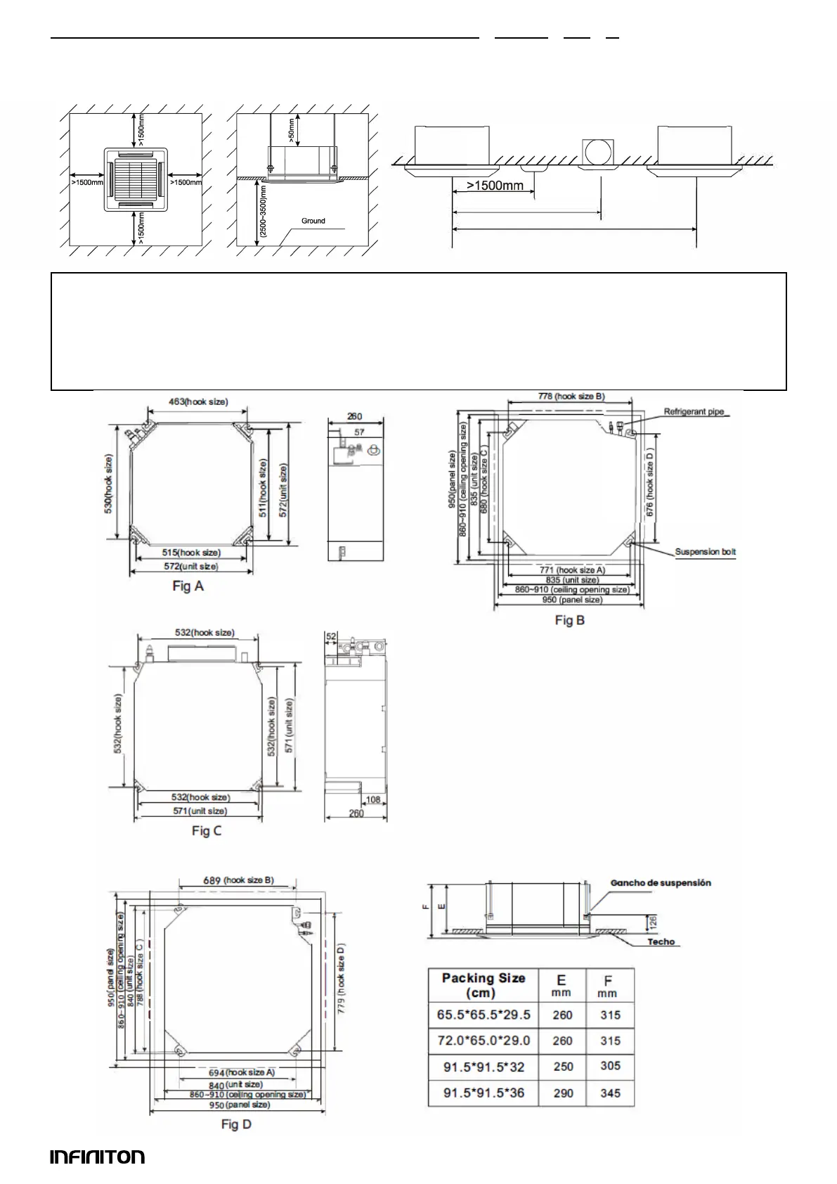 A unidade de ar condicionado com cassete de tecto tem quatro tipos de formas, Fig. A, Fig. B, Fig. C e