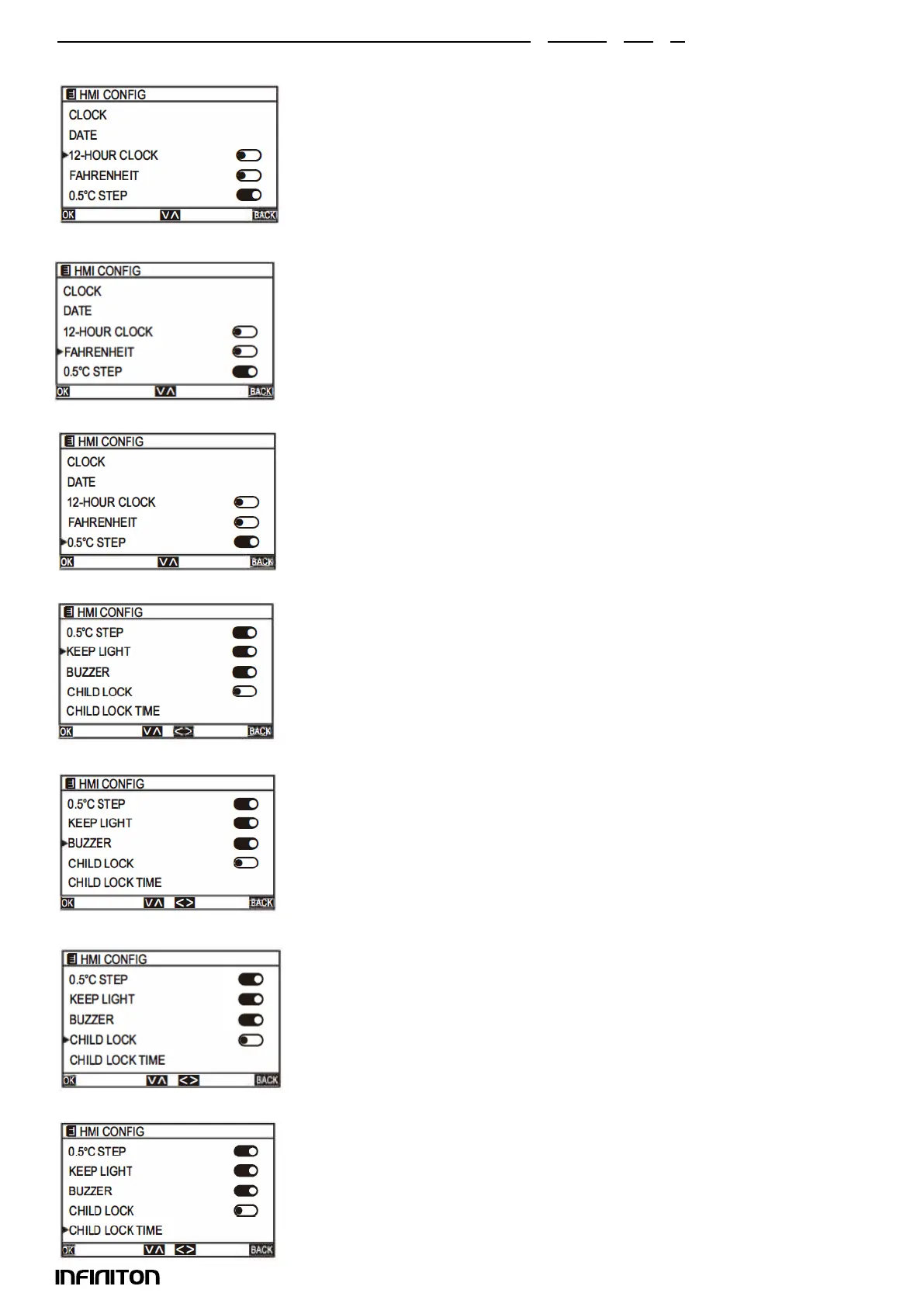 Na página do HMI CONFIG, seleccionar 0,5ºC STEP e premir “ <. “ ou “ > “ para