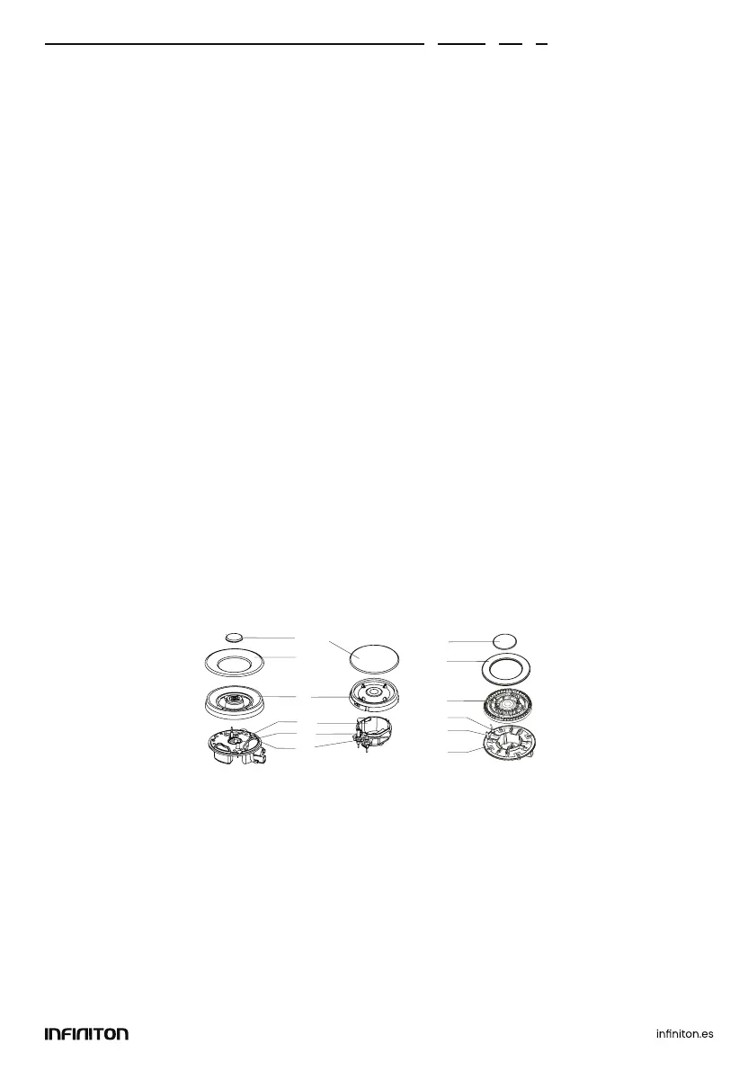 Place the burner cover (1,2,3) over the flame diffuser (4), so that they fit into their respective holes.