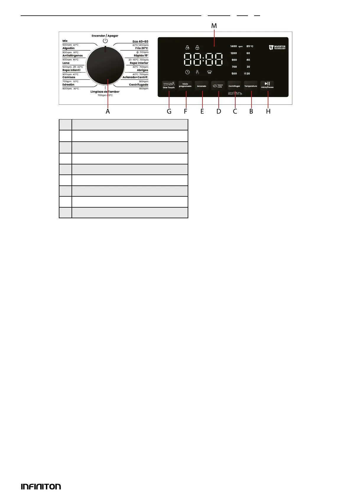 A. Wash cycle selector: Allows you to set the desired wash cycle (see “Wash cycle table”).