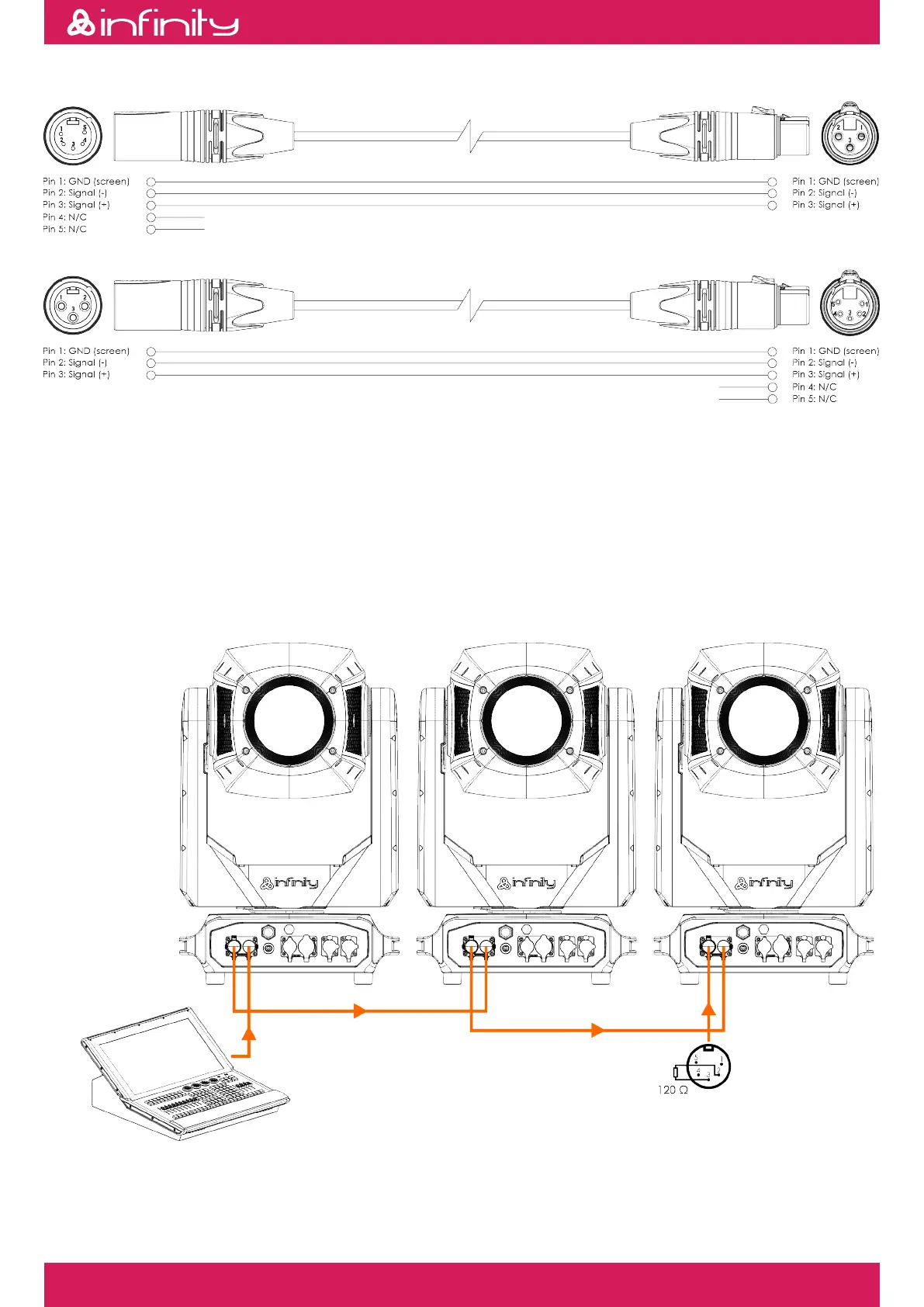 04) Connect a DMX terminator (120 Ω resistor) to the DMX OUT connector of the last device on the data link.04)