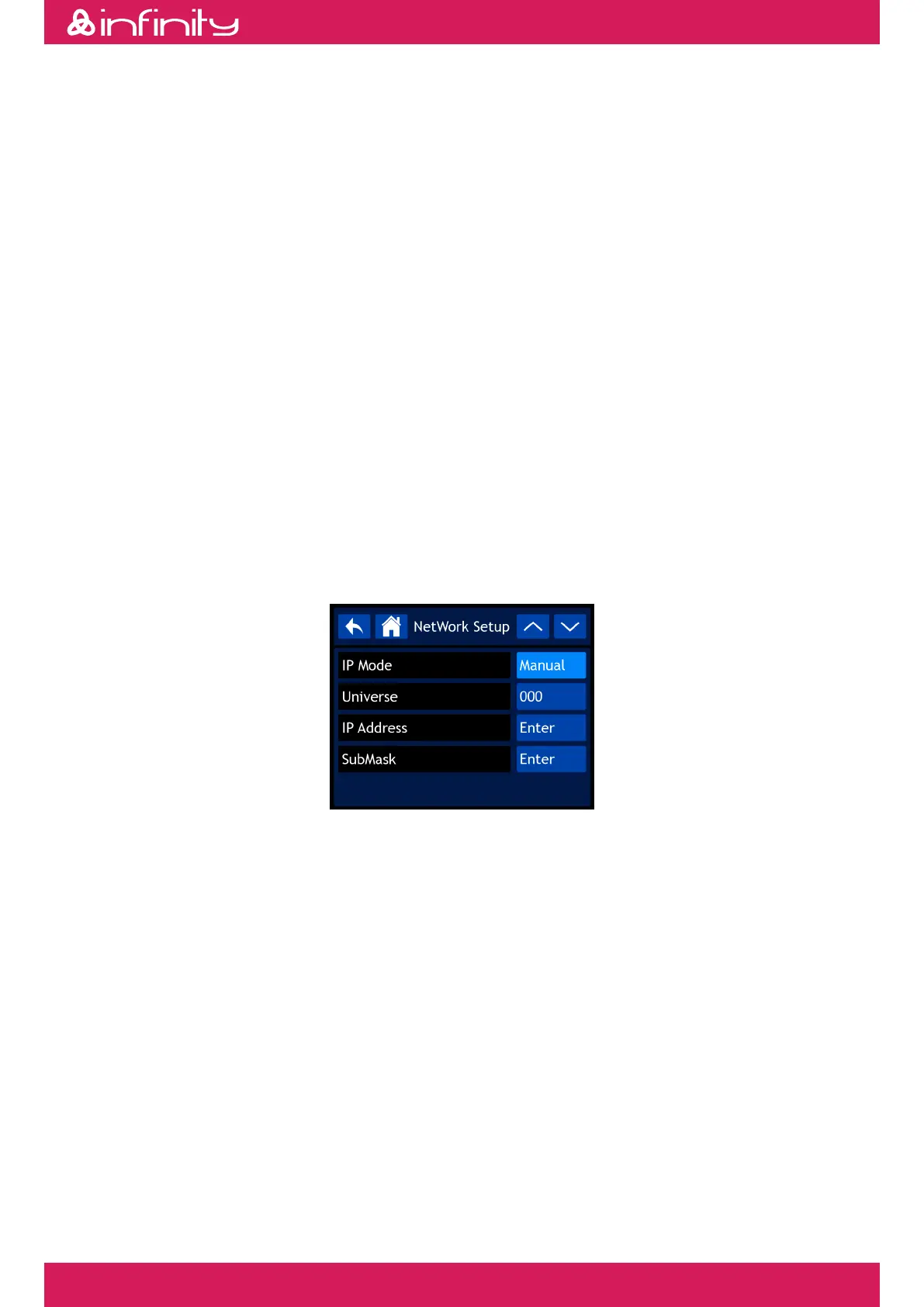 • Universe: Set the Universe. The range is 000–255 for Art-Net/001–256 for sACN•