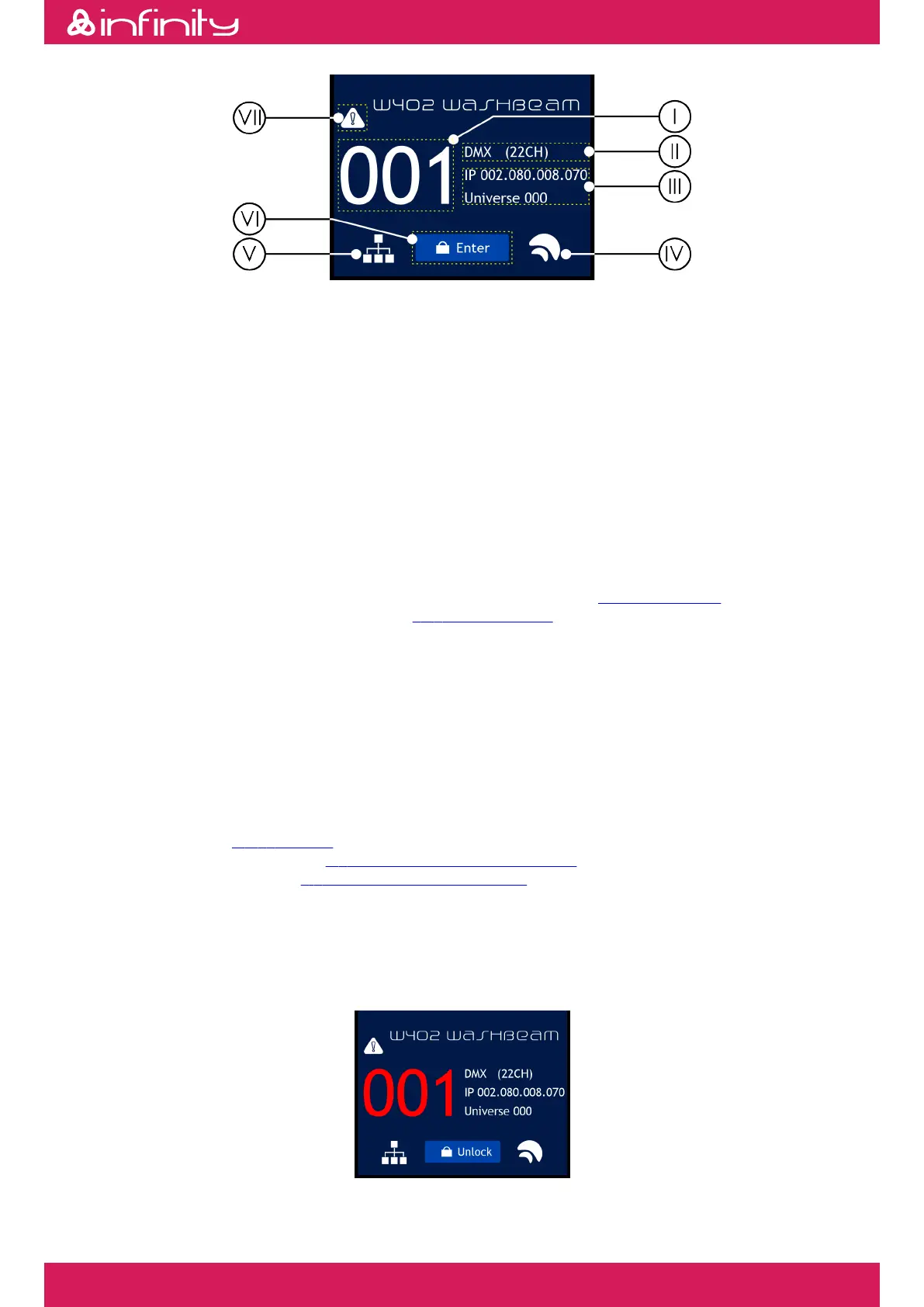 IV. W-DMX indicator: if the control protocol of the device is set to W-DMX (Wireless DMX), the W-DMX indicatorIV.