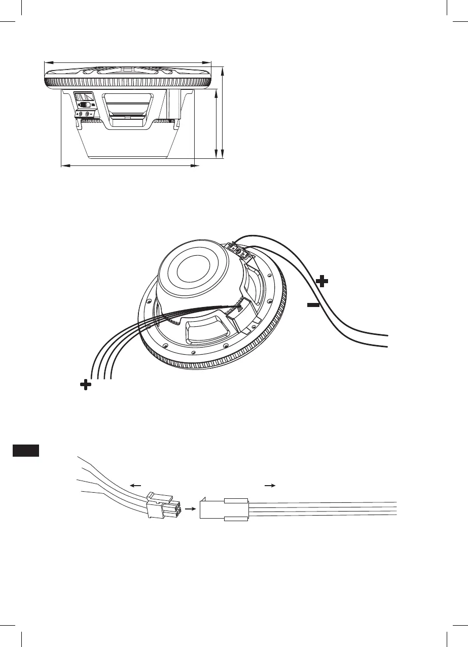 要向 Innity 船载扬声器发送信号,请将正极 (+) 和负极 (-) 扬声器线缆连接到您的源设备或功放的合适的扬声器输出。 请确