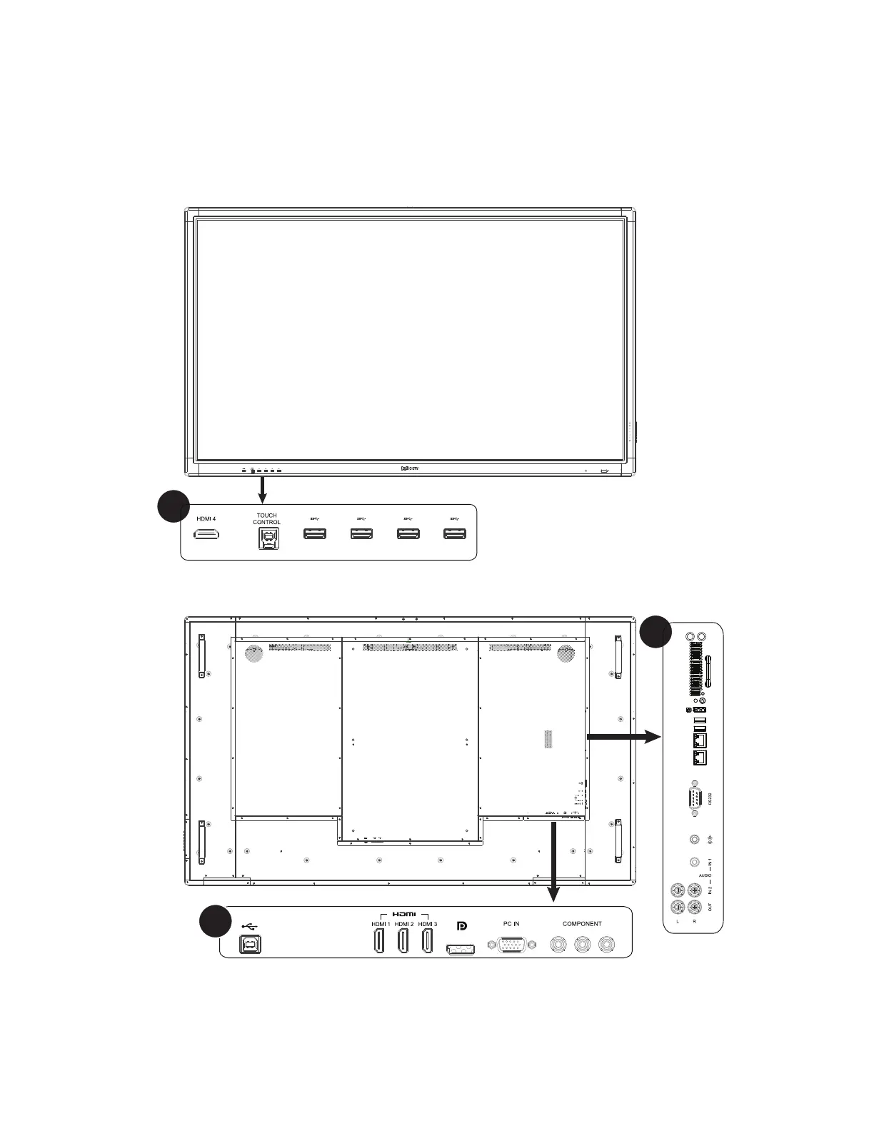Available jacks include: USB-B for touch control (2), USB 3.0-A (6), HDMI In (4), DisplayPort (1), PC In (1), Component