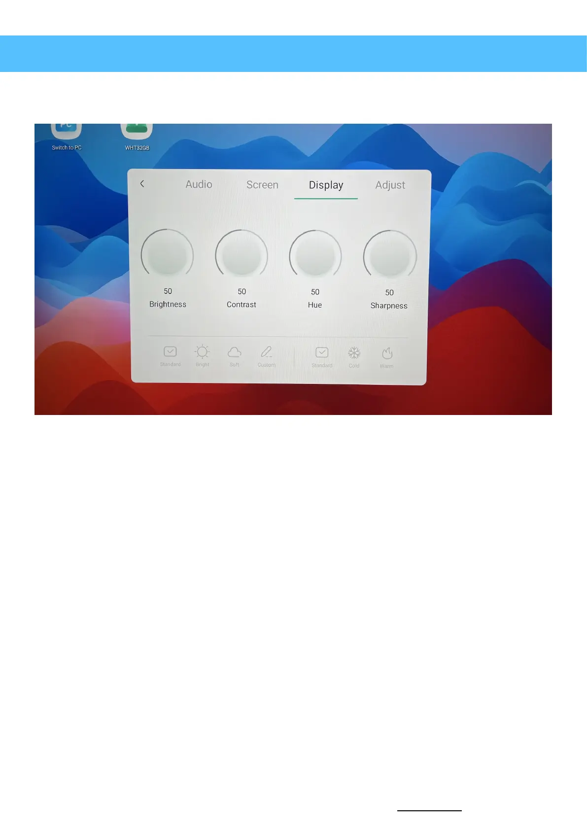 selected at the bottom by pressing “Standard”, “Bright” or “Soft”. It will adjust the Brightness, Contrast,