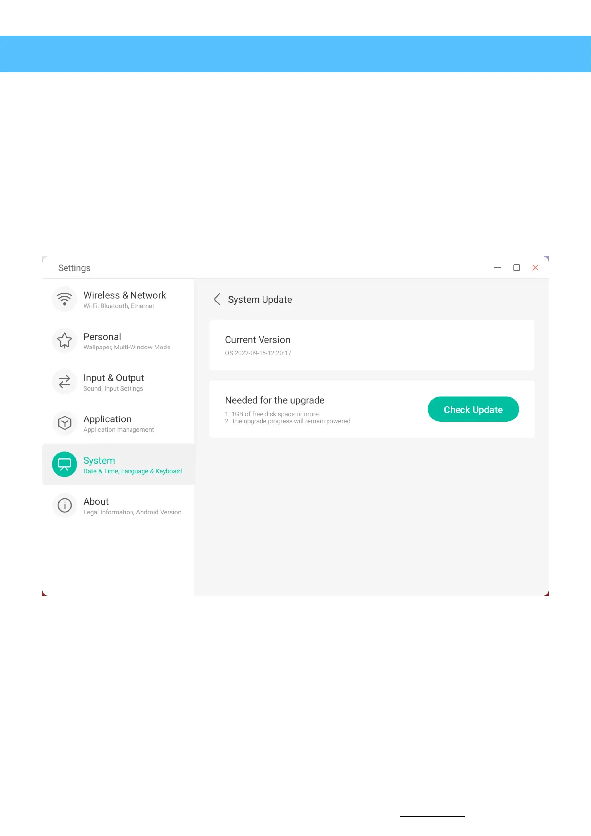 the display at time when in use. To check if any updates are available, press the “check update” button and