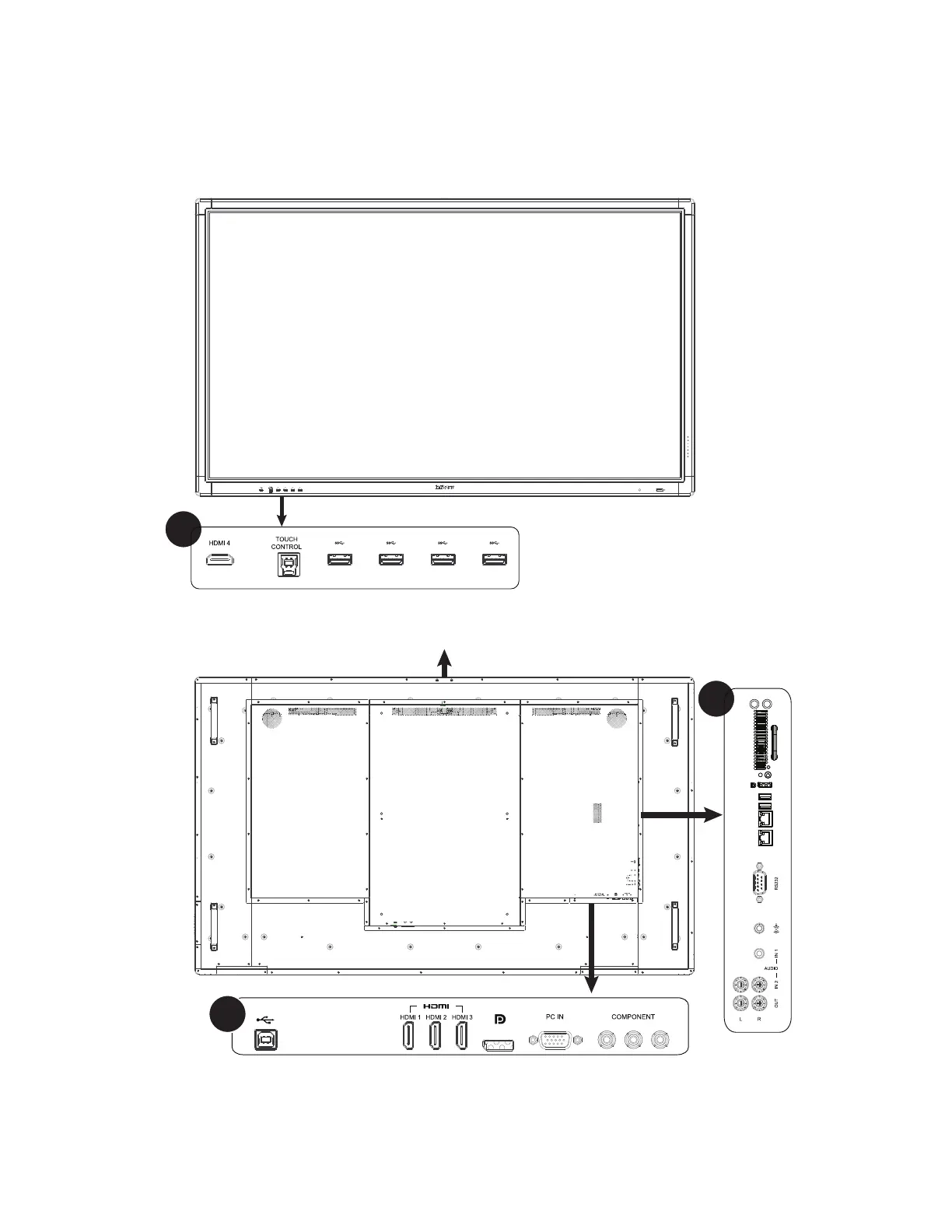 on the back and side of the display. Available jacks include: USB-B for touch control (2), USB 3.0-A (6), HDMI In (4),