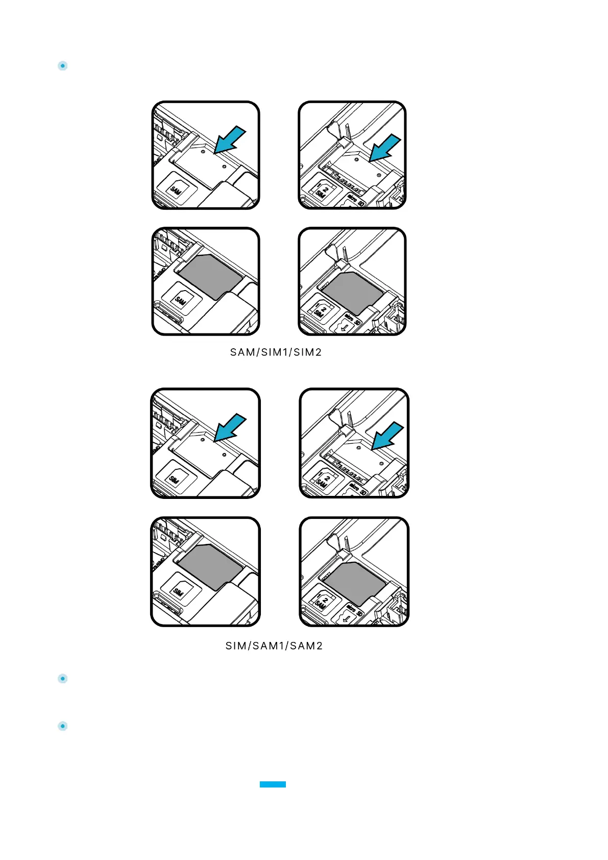When introducing a SAM/SIM into slot, be sure to put the cut corner as indicated on the