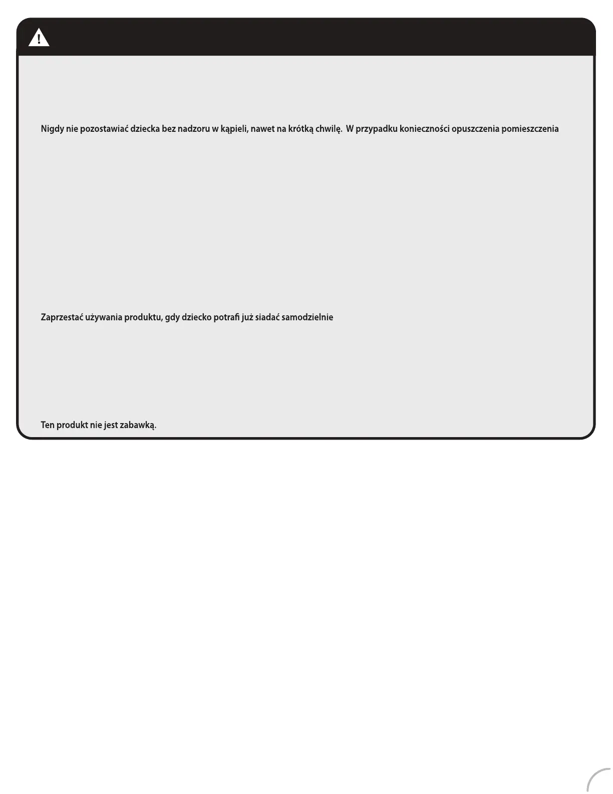 • Sprawdzic temperature wody, w której umieszczony jest produkt, przed umieszczeniem dziecka w produkcie. Generalnie temperatura wody