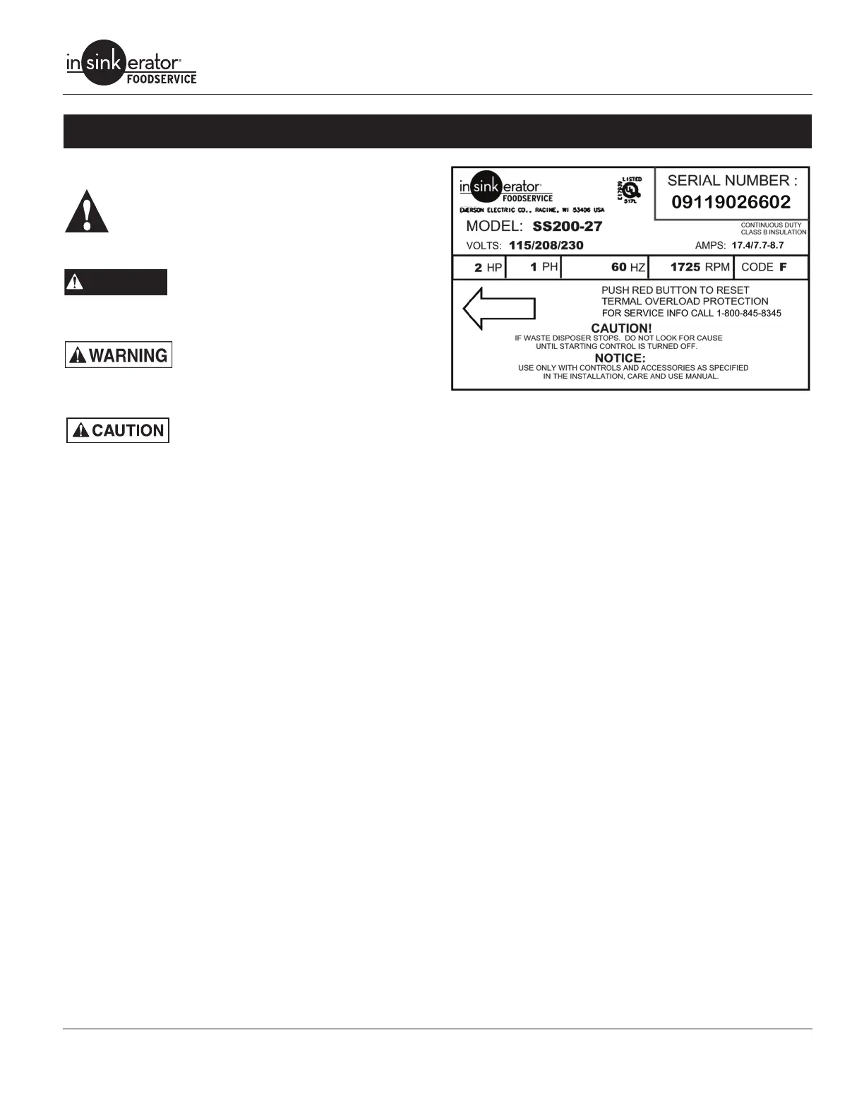 disposer specications, power supply, and electrical controls.