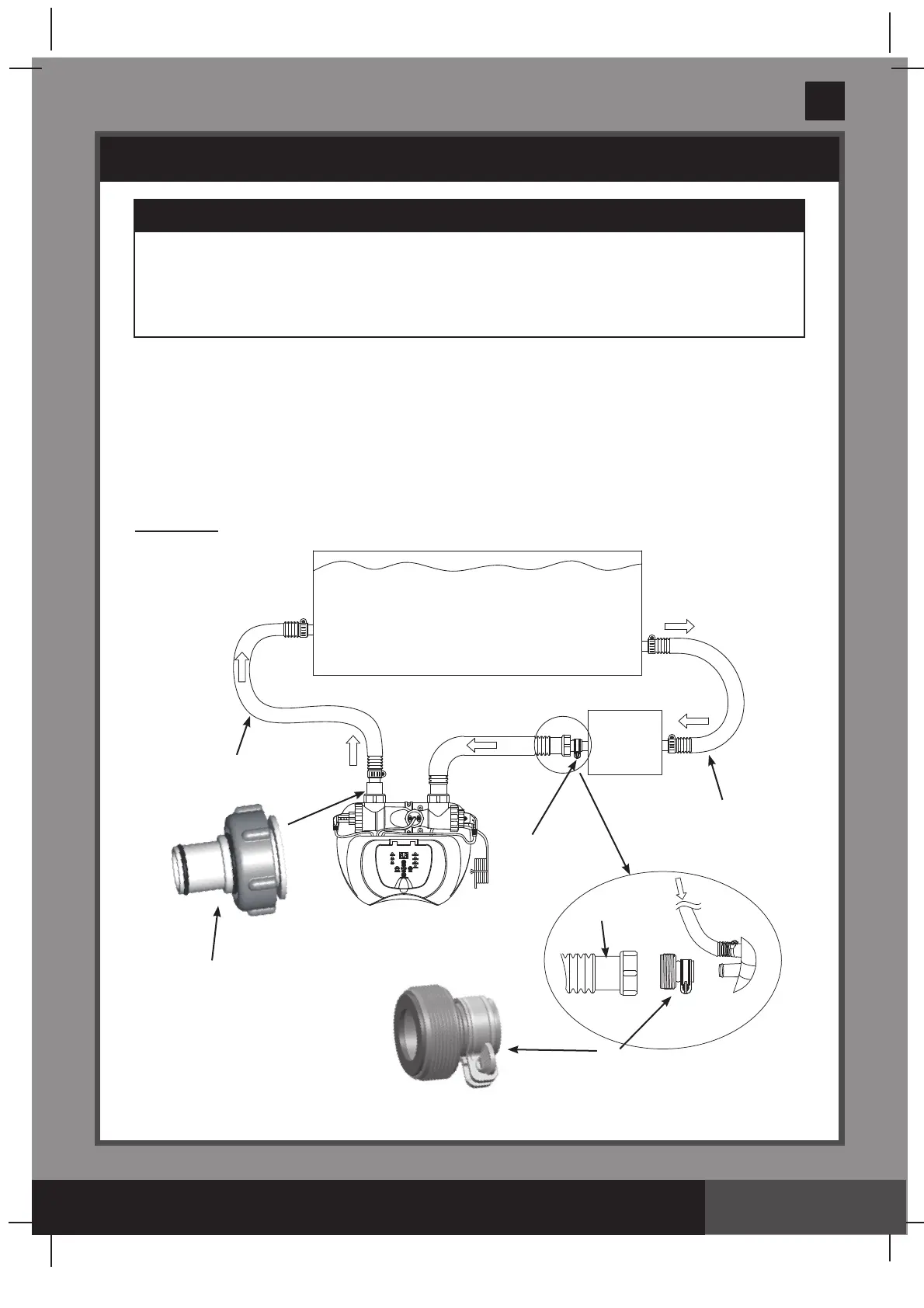 Connecting the system to pump and pool with 1-1/4” (32mm) connections/hoses: