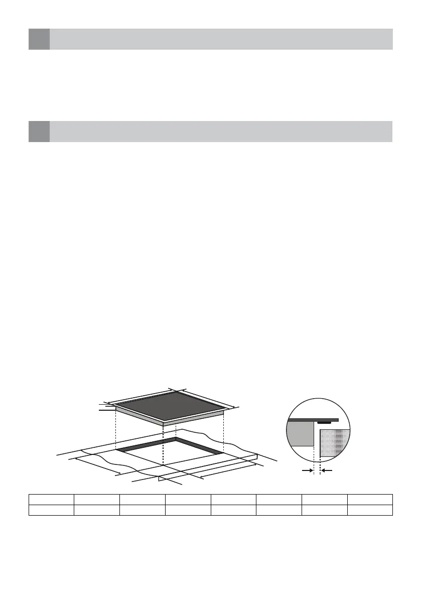 • Le plan de travail où la table de cuisson est montée doit être lisse, horizontale et stable. Observez les instructions