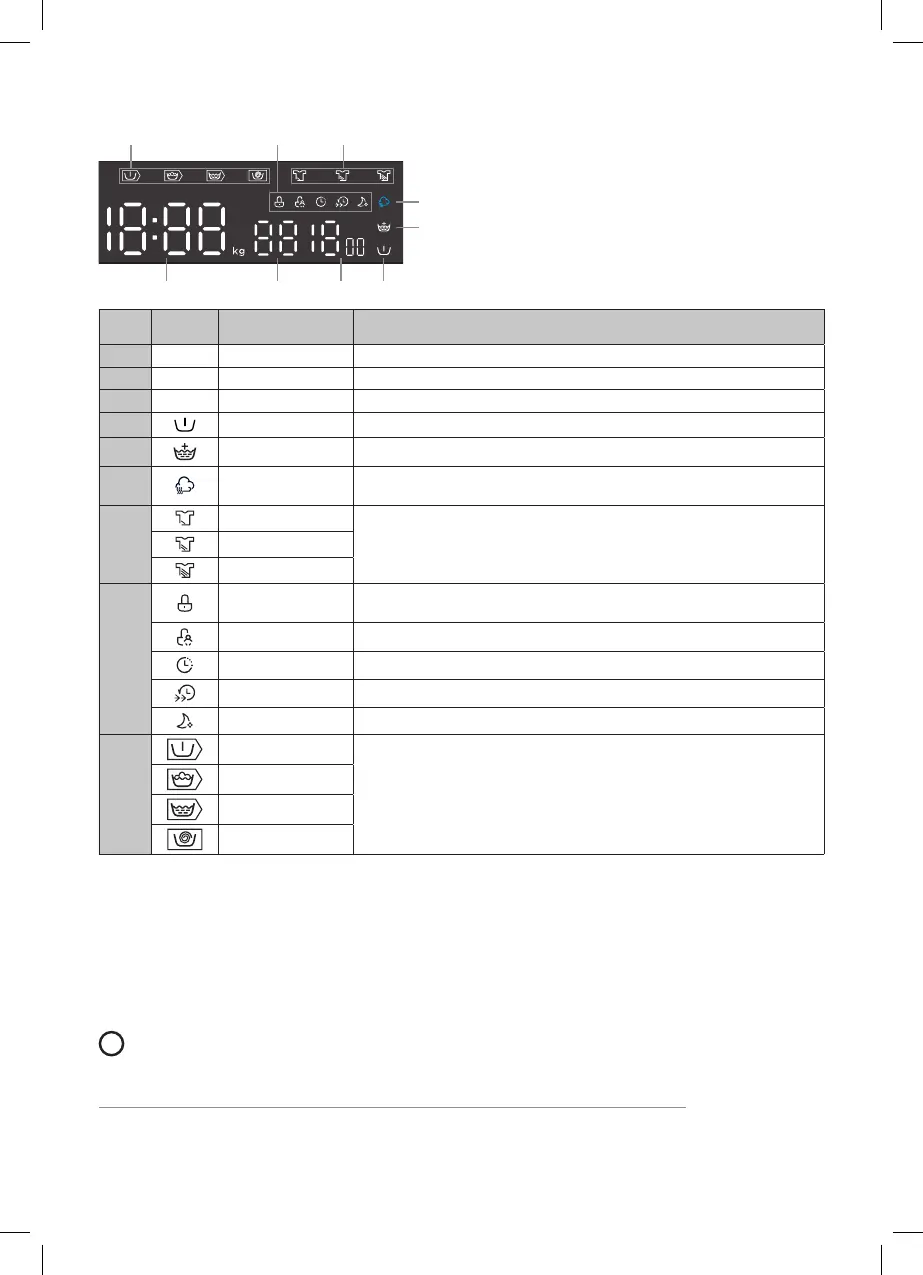 Zeigt die Waschzeit, Verzögerungszeit, Fehlercodes und Ende an