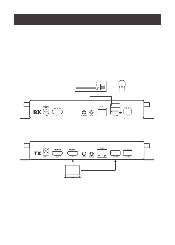 Connect keyboard/ mouse to the receiver USB-A ports, then connect the included