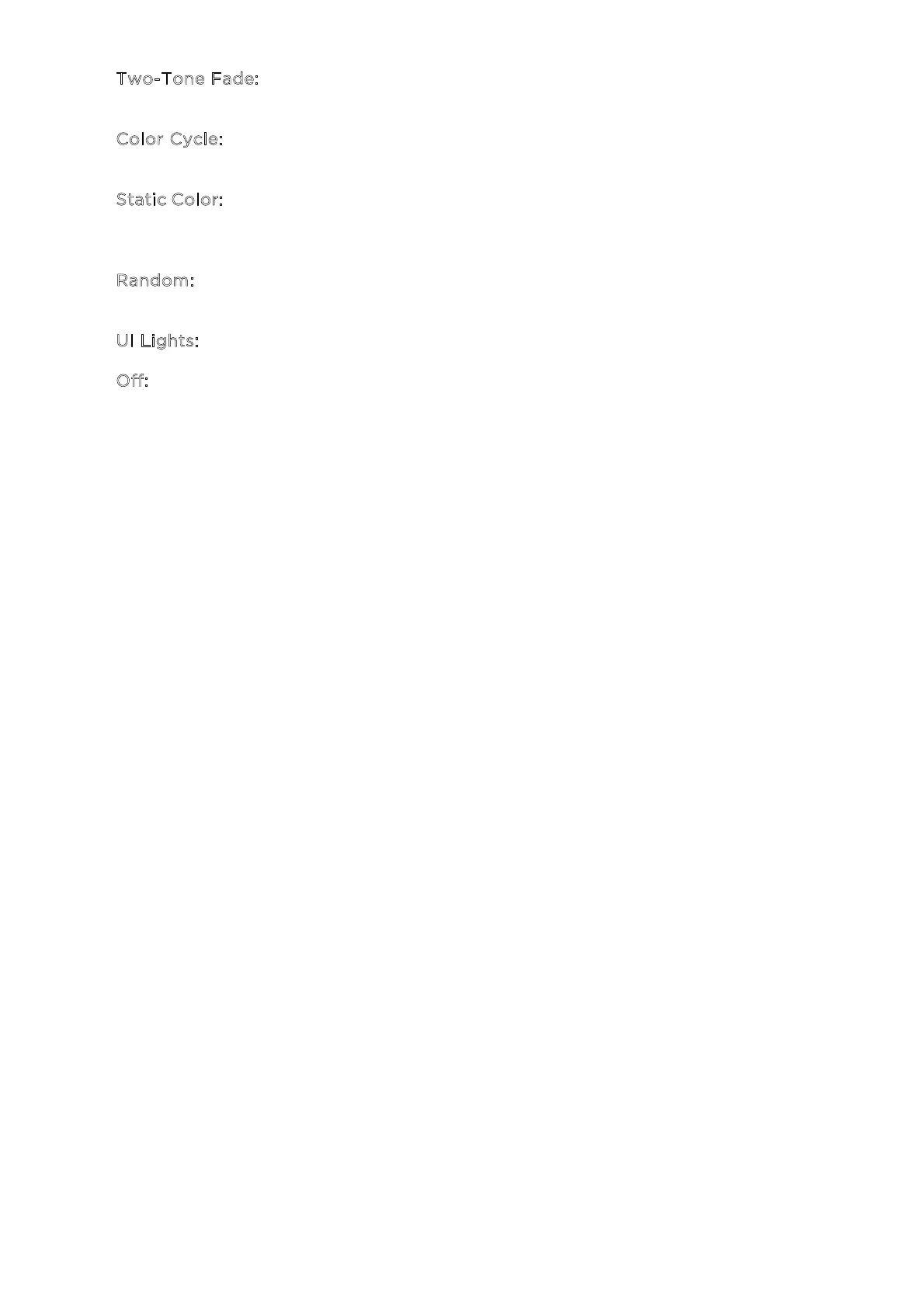 • Two-Tone Fade: All LEDs will fade in and out in a two-tone color as they cycle through