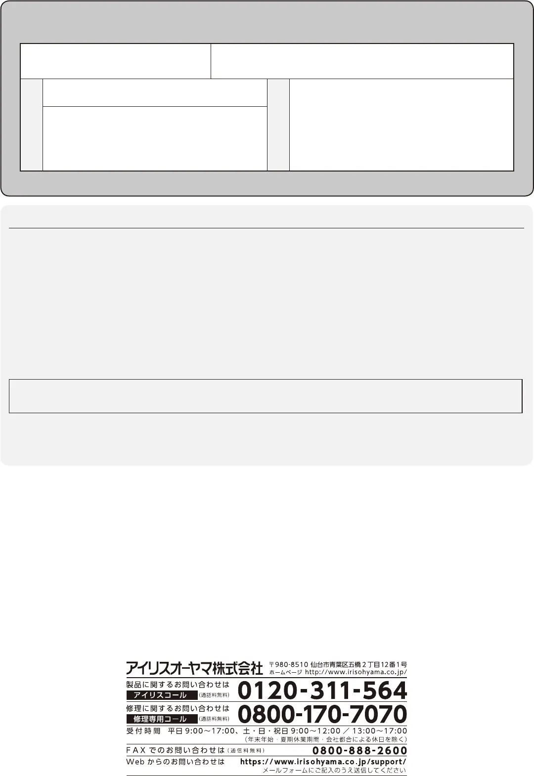 4● ご転居や贈答品などで本保証書に記入してある販売店に修理をご依頼になれない場合には、アイリスコールにお問い合わせください。